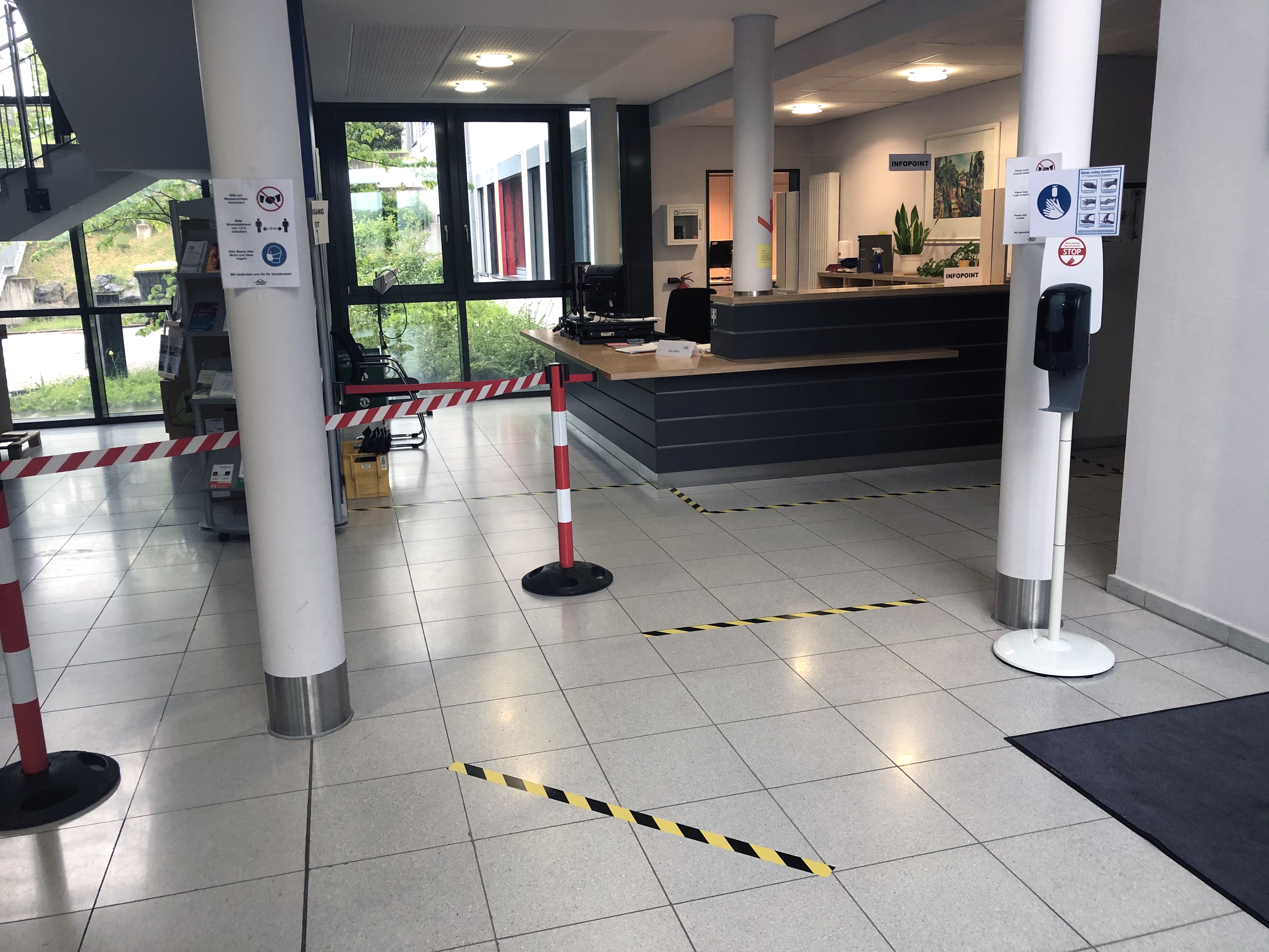 Klebemarkierungen auf dem Boden der Gebäude der Kreisverwaltung, Handdesinfektionsspender sowie Plexiglasscheiben sorgen für notwendige Sicherheit, sowohl beim Personal, als auch bei den Besuchern / Foto: Jennifer Sippel / Vogelsbergkreis