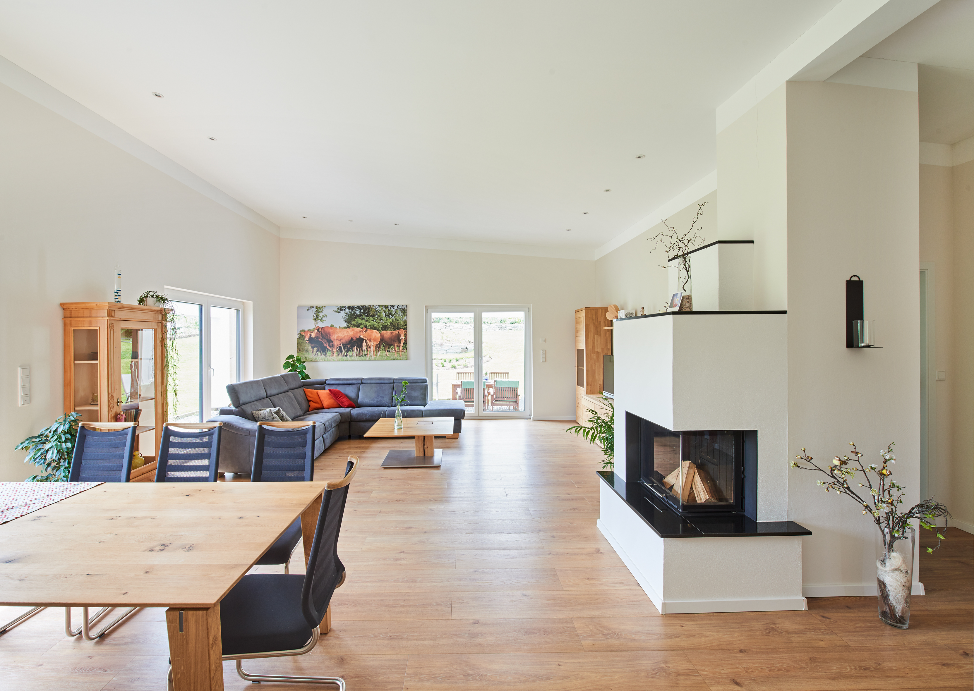 Ebenerdig: Alle Wohnräume sind bequem auf einer Ebene erreichbar. Dank der offenen Architektur bieten die Räume viel Platz und natürliches Licht
