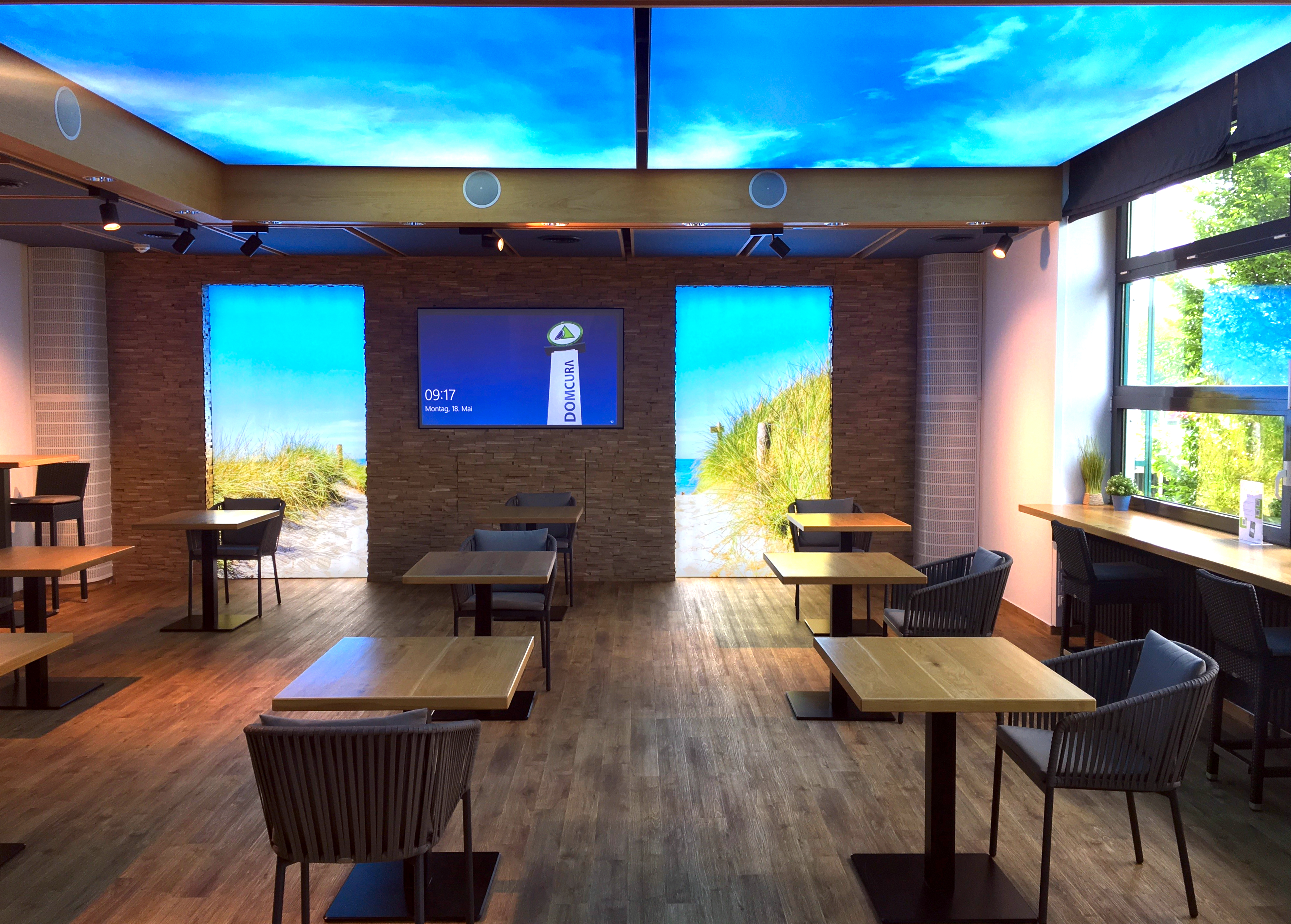 Das „Aquarium“ von innen. Während der Corona-Krise ist die Kantine der DOMCURA als sonstiger Treffpunkt mit den vereinzelten Plätzen ein Sinnbild für die Sicherheitsmaßnahmen.