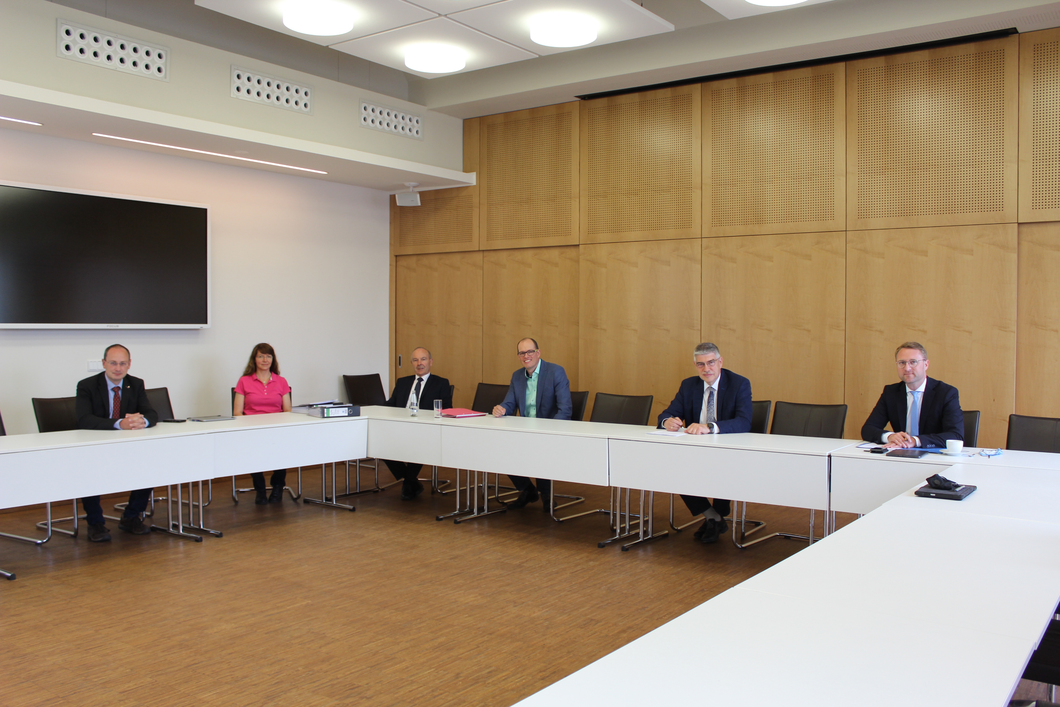 Bürgermeister Sebastian Stang (von links) und Erste Beigeordnete Martina Hornung von der Gemeinde Grebenhain, Erich Koch, Erster Beigeordneter der Gemeinde Freiensteinau und Bürgermeister Sascha Spielberger, Landrat Manfred Görig und Erster Kreisbeigeordneter Dr. Jens Mischak unterzeichneten gemeinsam den Gesellschaftervertrag für das erste interkommunale MVZ im Vogelsbergkreis(Foto: Vogelsbergkreis / Christian Lips)