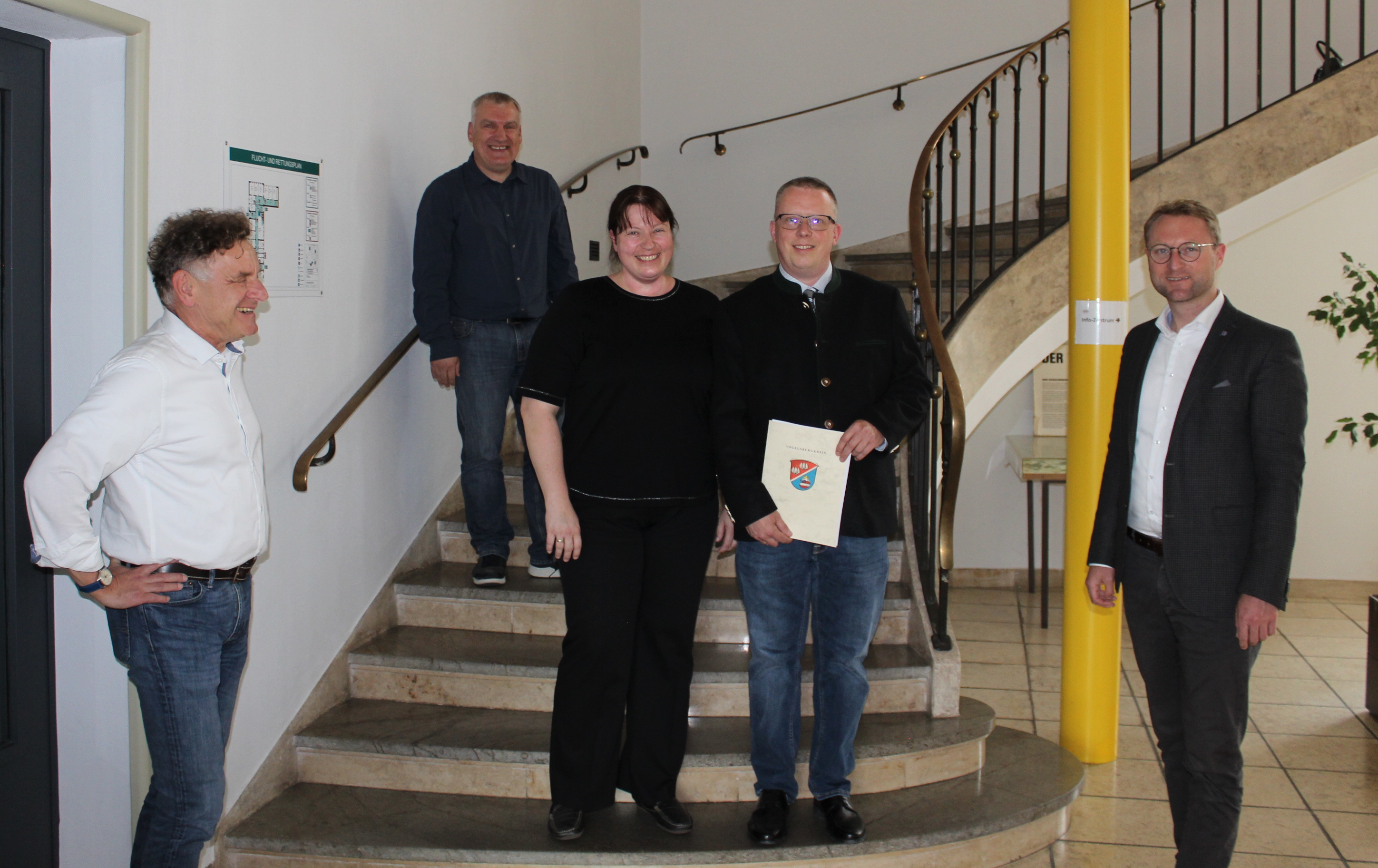 Freude über den Zuwendungsbescheid: Thomas Schaumberg (von links), Peter Sukdolak, beide vom Amt für Wirtschaft und den ländlichen Raum, überreichten gemeinsam mit Erstem Kreisbeigeordneten Dr. Jens Mischak, den Förderbescheid in Höhe von knapp 54.000 Euro an Sonja und Dr. Roland Gross. (Foto: Christian Lips/Vogelsbergkreis)