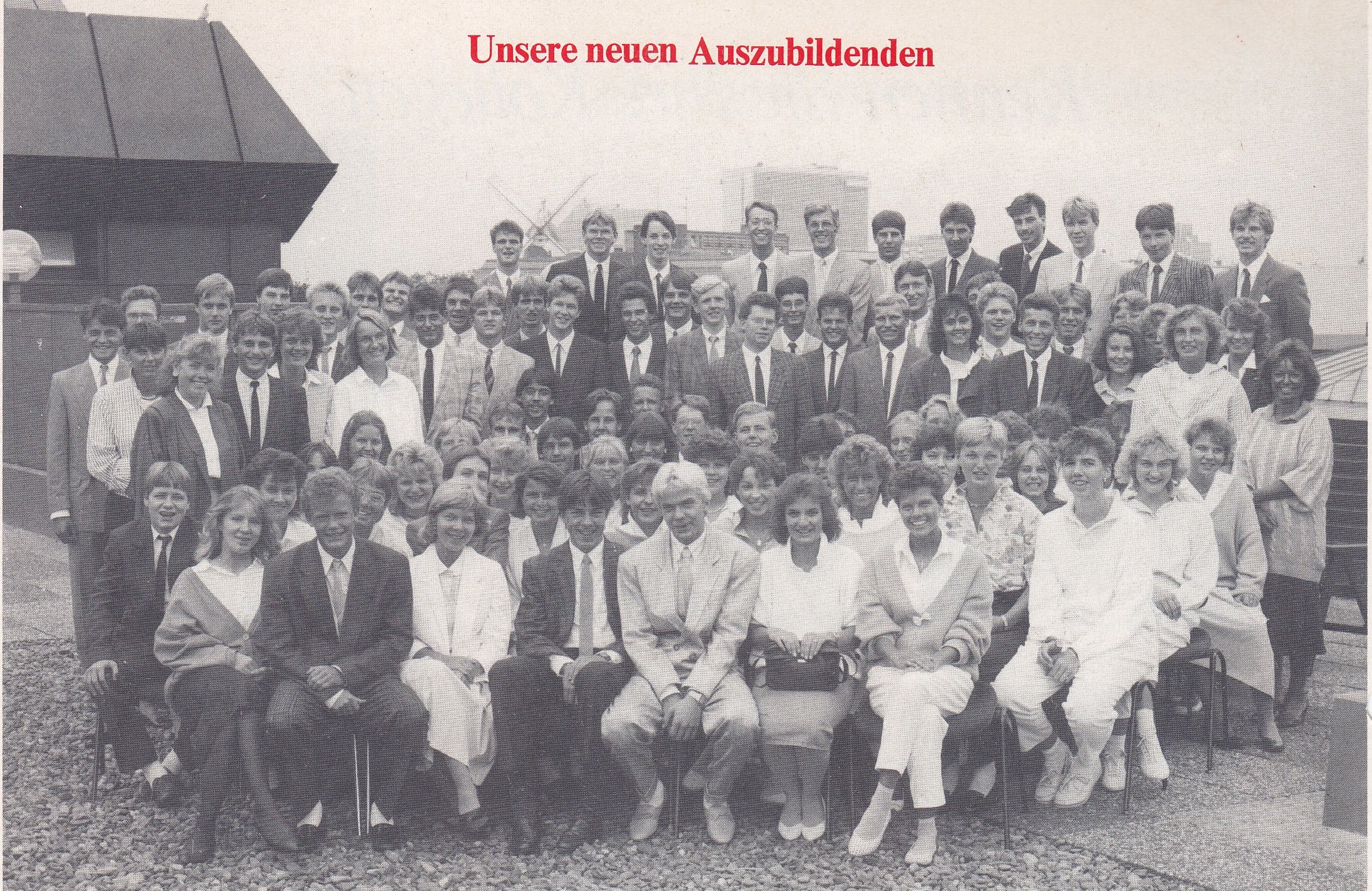 Der Ausbildungsjahrgang 1986 auf der Dachterrasse der Sparkasse Bremen, Hauptgebäude Am Brill (vordere Reihe, zweiter von links: Kay Noffke)
