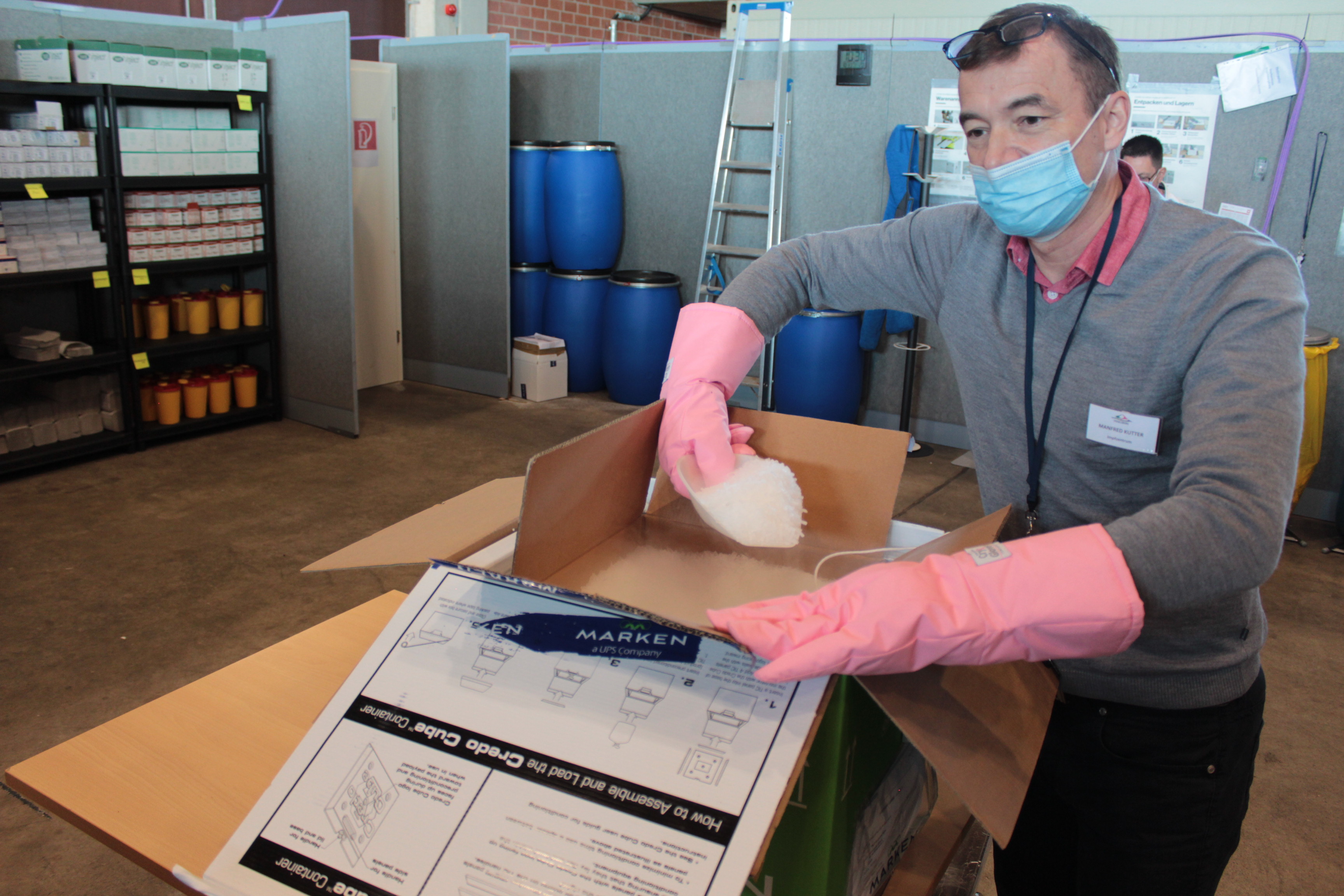 Gut gekühlt kommt der Impfstoff von BionTech in der Hessenhalle an, dort wird er von Apotheker Manfred Kutter und seinem Team aufbereitet. Foto: Sabine Galle-Schäfer/Vogelsbergkreis