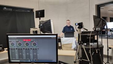 Ausbilder Ralf Winter aus Mücke während des Online-Lehrgangs im Studio der Feuerwehr Alsfeld. Gemeinsam mit Carsten Naumann aus Schotten und Markus Weppler aus Schlitz vermittelte er die Inhalte, des "Sprechfunkberechtigungslehrgangs"