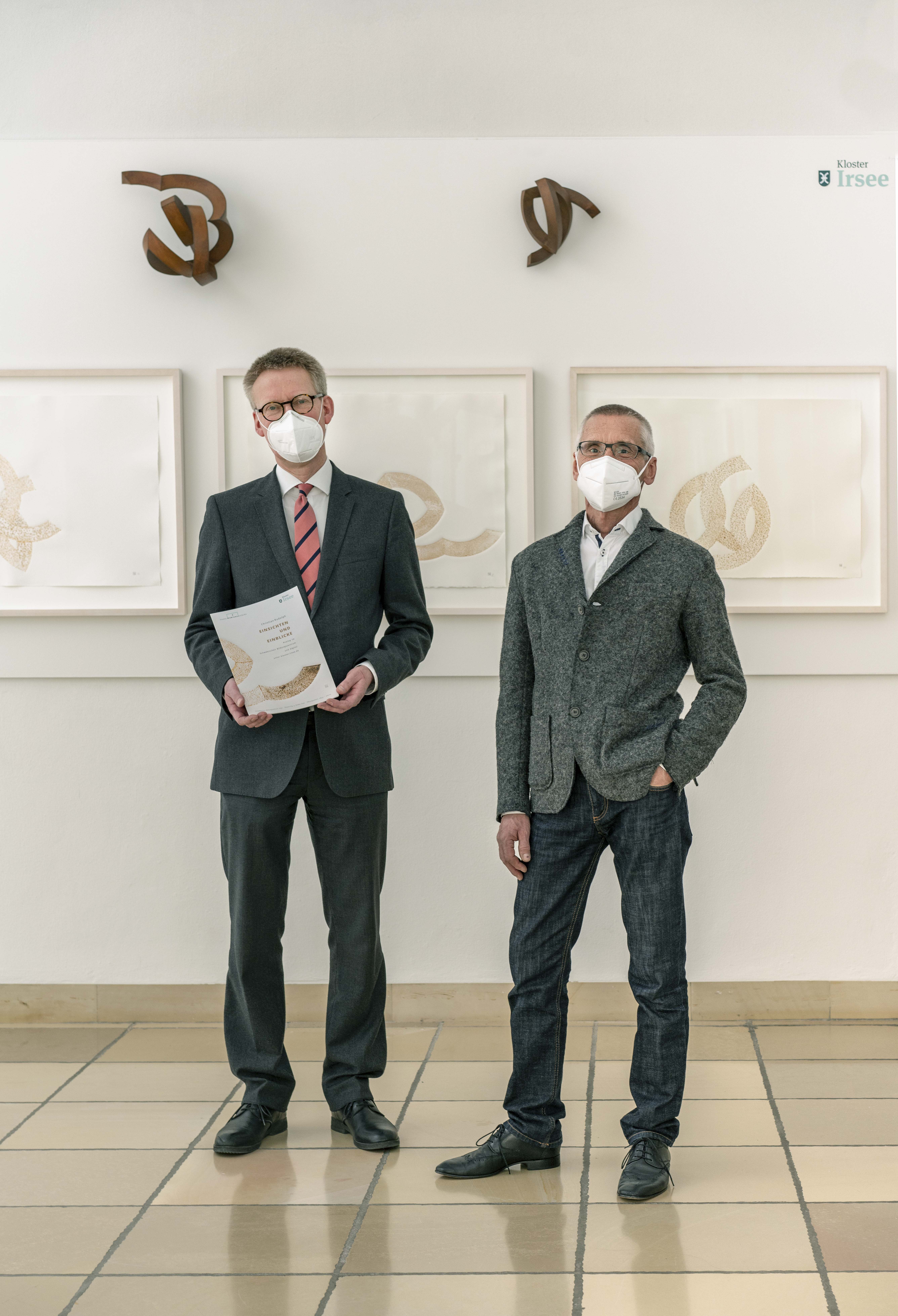 Dr. Stefan Raueiser (Leiter des Schwäbischen Bildungszentrum) mit dem Künstler Christian Rudolph (rechts) in der Ausstellung