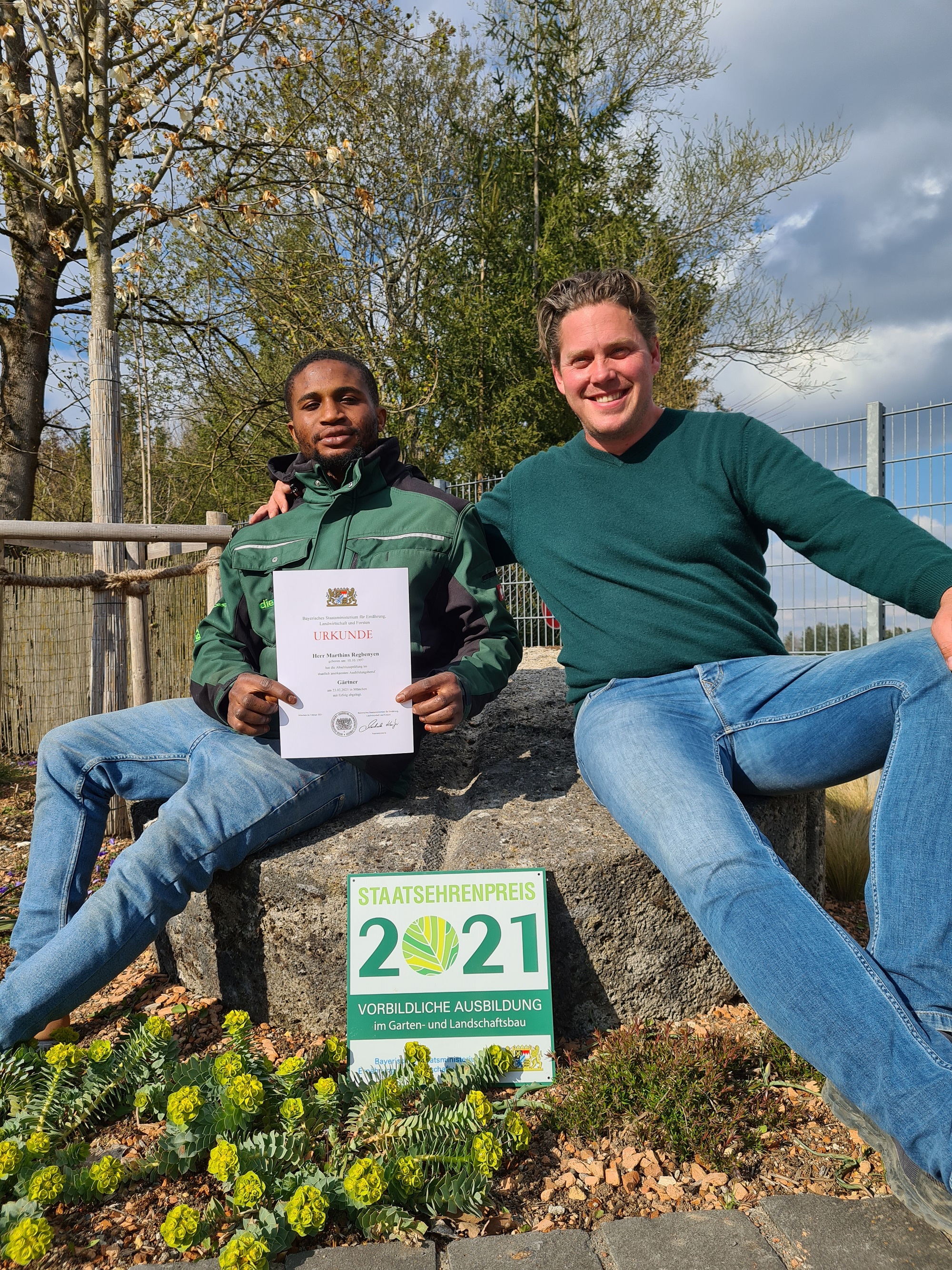 Foto (Firma Die Gartenzwerge): Marthins Regbenyen (links), der bei den Gartenzwergen seine Ausbildung zum Landschaftsgärtner erfolgreich absolvierte, zusammen mit Mario Nast, Inhaber der Firma Die Gartenzwerge.