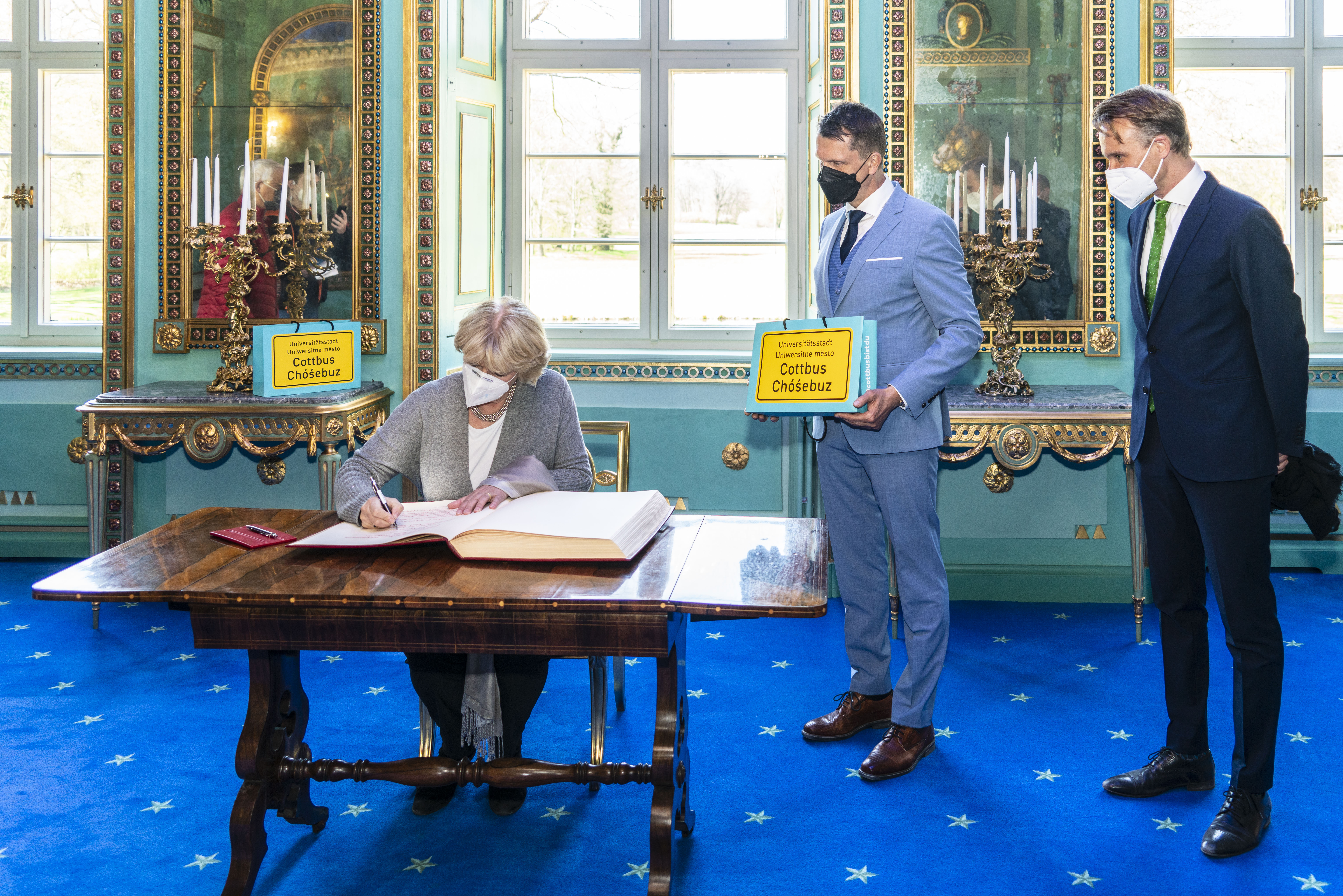 Monika Grütters (Kulturstaatsministerin) trägt sich im Grünen Saal im Schloss Branitz in das Goldene Buch der Stadt Cottbus ein. Rechts daneben: Holger Kelch (Cottbuser Oberbürgermeister), Stefan Körner (Vorstand SFPM)/ Foto: © SFPM/codiarts. ® Harry Müller