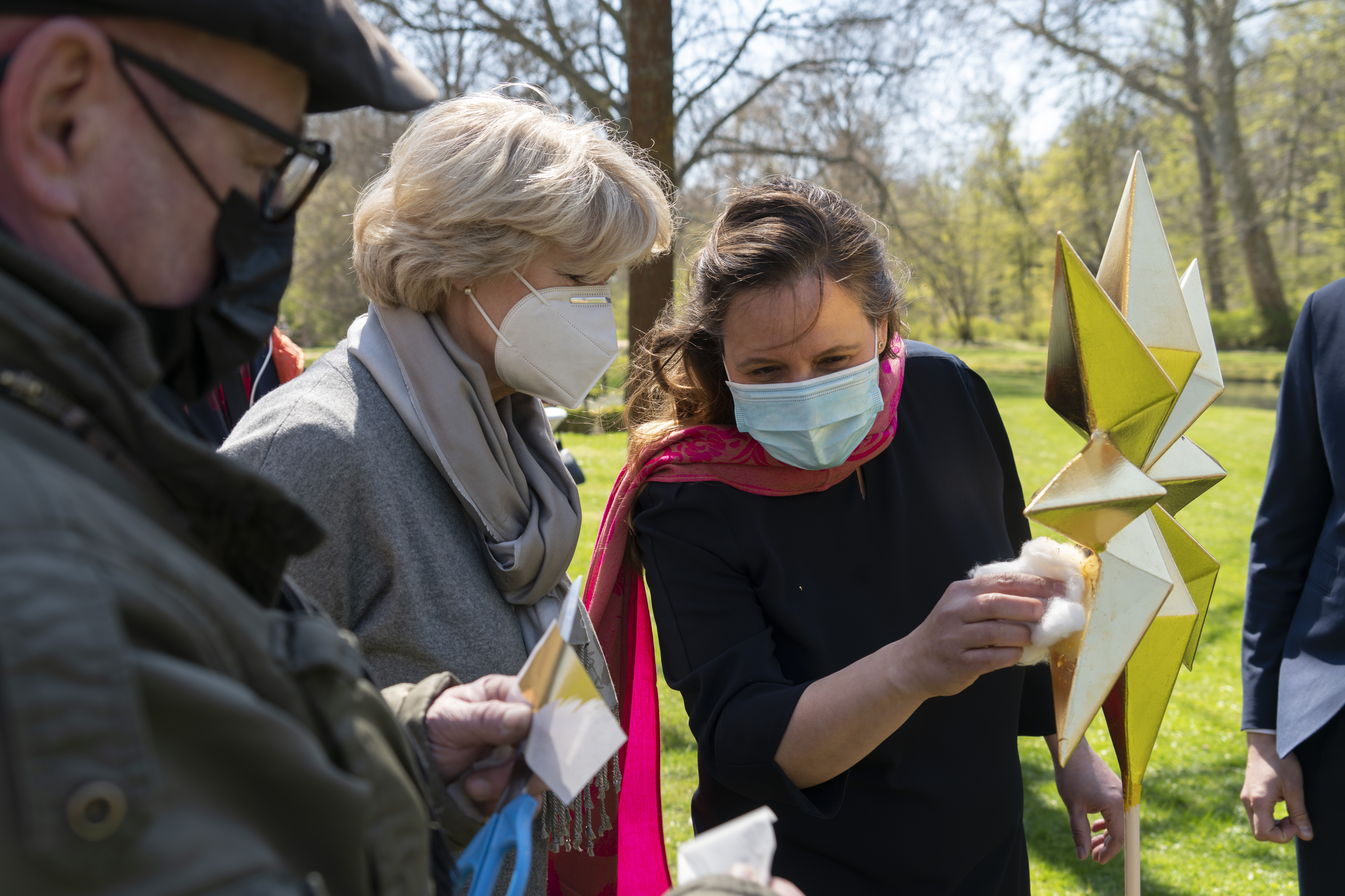 Restaurator Jens-Uwe Möbert (SFPM) mit Monika Grütters, Manja Schüle und Stefan Körner beim Vergolden eines Sterns, der als Bauschmuck die restaurierte Parkschmiede zieren wird/ Foto: © SFPM/codiarts. ® Harry Müller