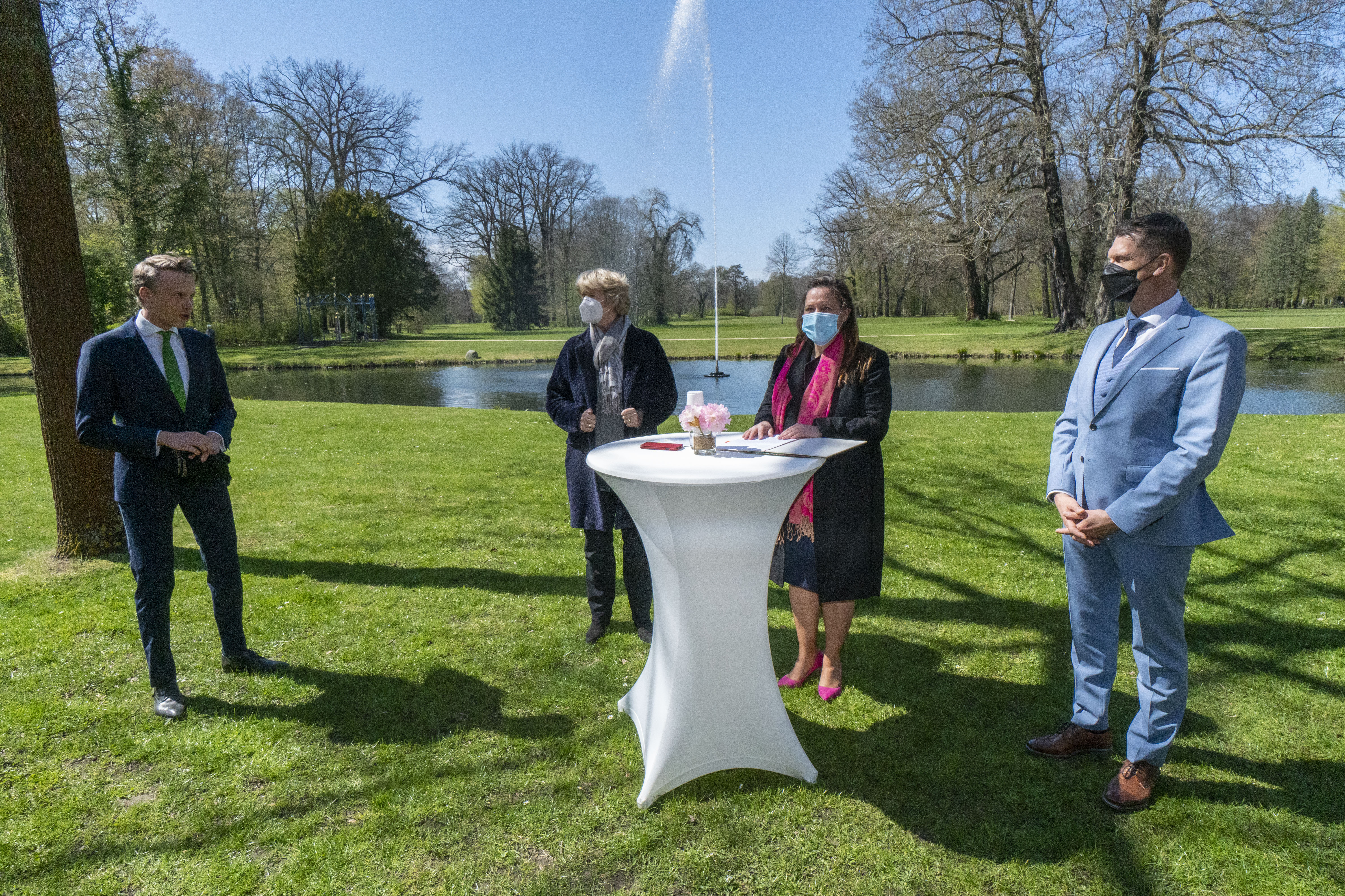Stefan Körner (Vorstand SFPM), Kulturstaatsministerin Monika Grütters, Manja Schüle (Brandenburgs Kulturministerin) und Holger Kelch (Oberbürgermeister Stadt Cottbus) am Schlosssee mit der Jubiläumsfontäne/ Foto: © SFPM/codiarts. ® Harry Müller
