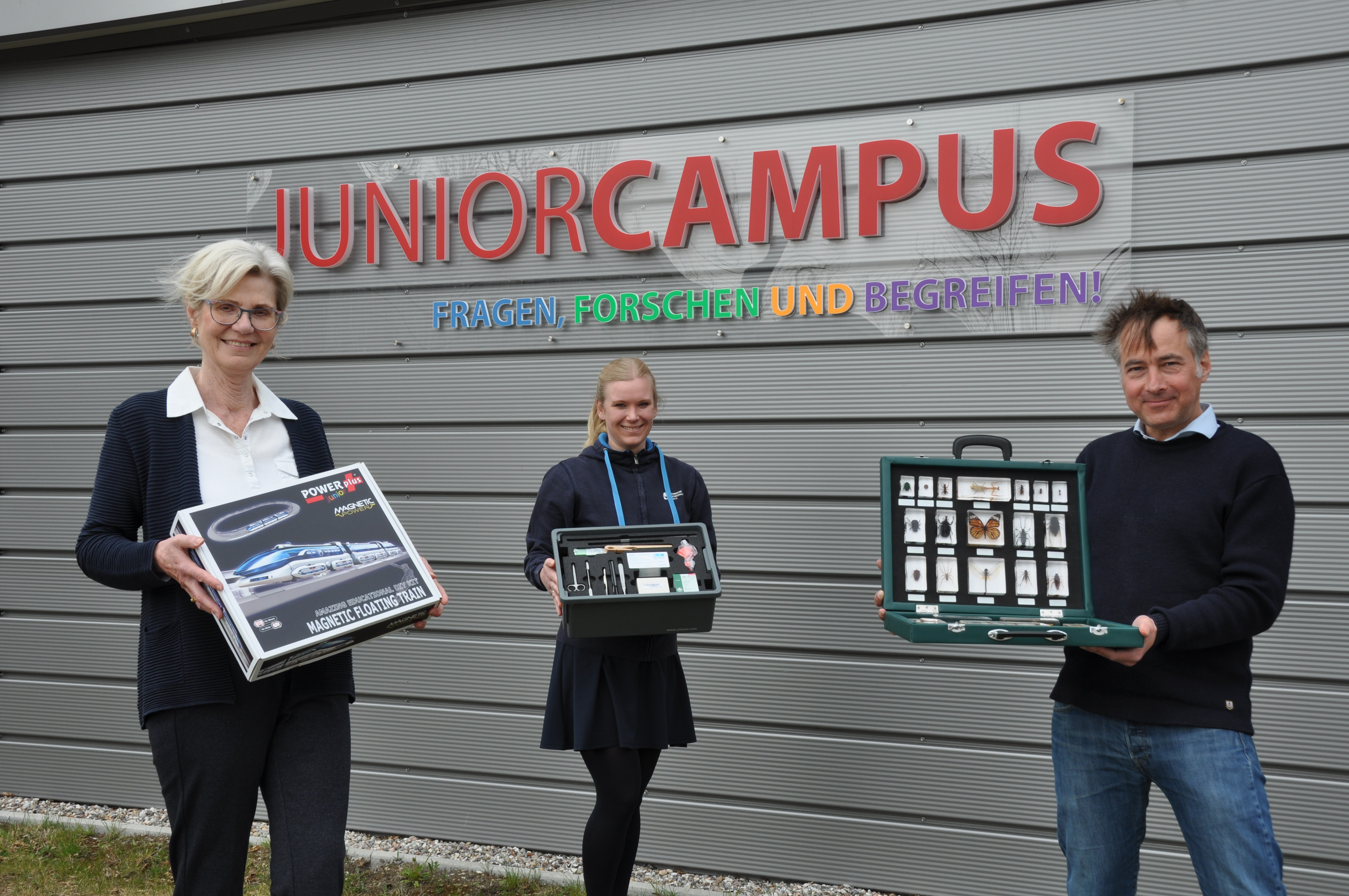 Neue Experimentierkoffer, v.l.n.r.: Stifterin Jutta Rochlitzer, JuniorCampus-Mitarbeiterin Nena Zabinski und JC-Leiter Prof. Dr. Jürgen Tchorz