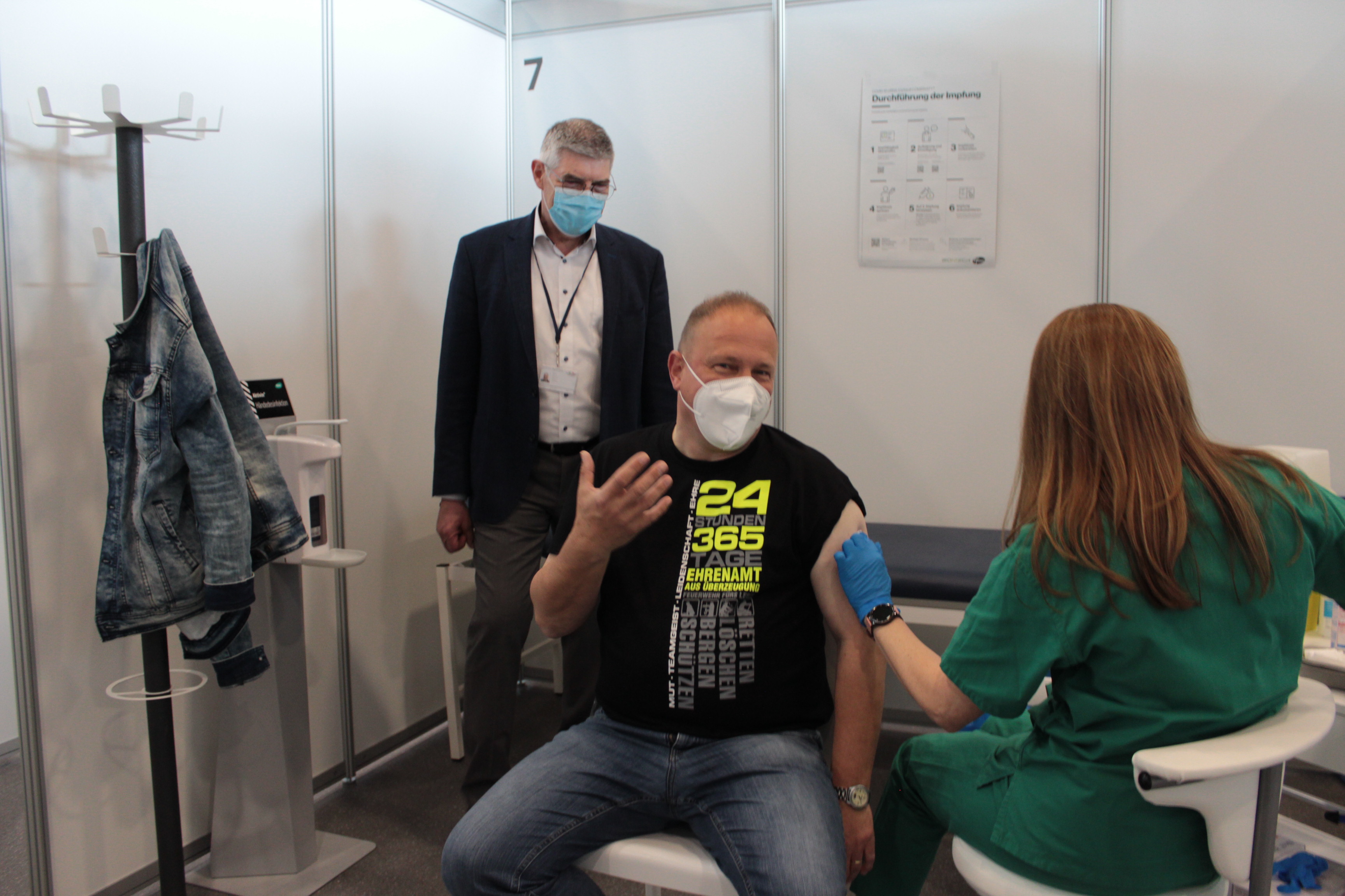 „Hat gar nicht weh getan“, schmunzelt Martin Zulauf, der am Freitagmittag als erster Feuerwehrmann seine Impfung erhalten hat. „An diesem Wochenende kamen rund 500 Feuerwehrmänner und –frauen aus dem gesamten Kreisgebiet ins Impfzentrum nach Alsfeld, um sich die erste Corona-Schutzimpfung geben zu lassen“, betont Landrat Manfred Görig. Foto: Sabine Galle-Schäfer/Vogelsbergkreis