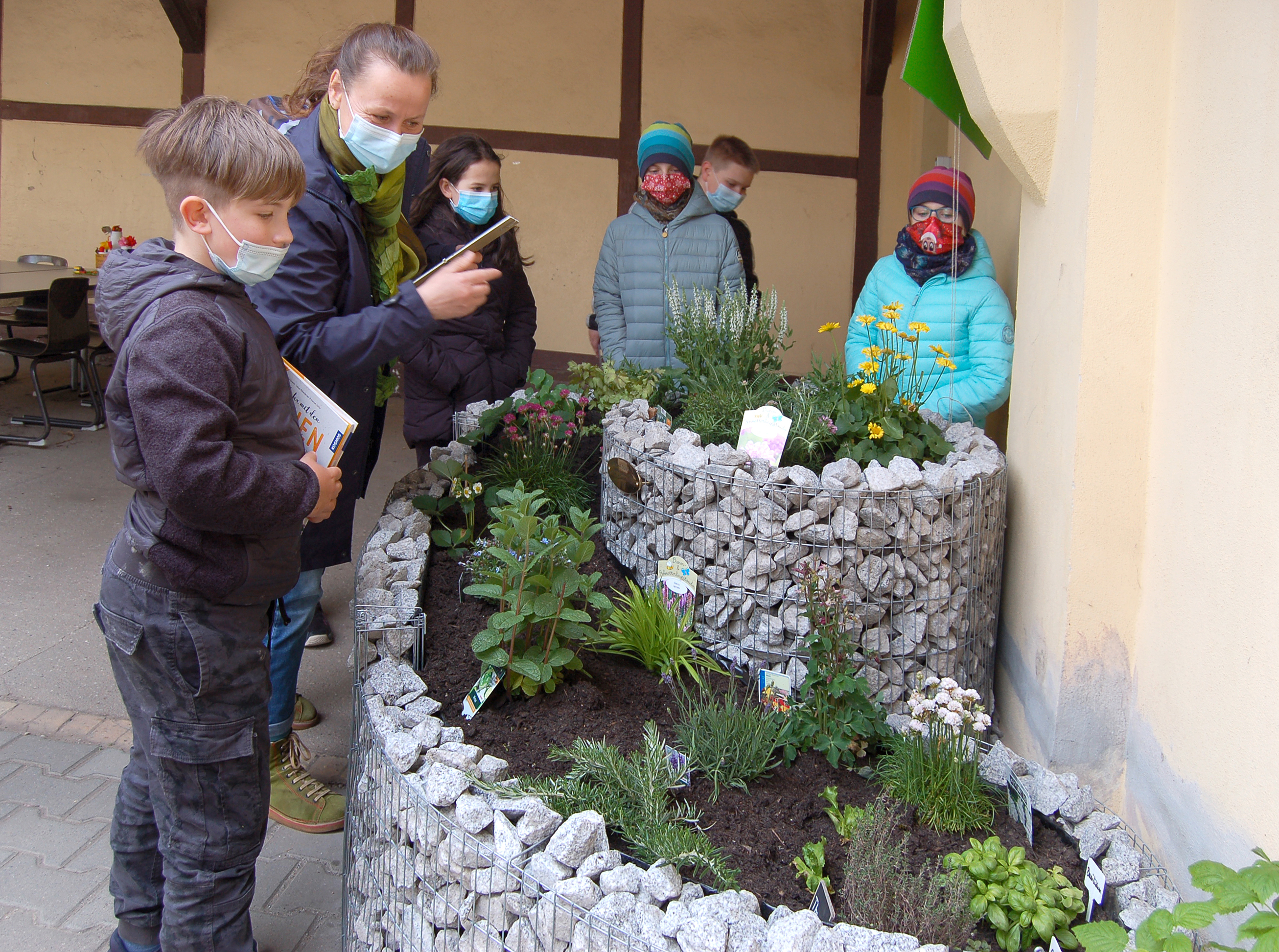 Hort-Leiterin Manuela Schildhauer freut sich mit den Kindern über die NektarTankstelle und das WildbienenHaus Bildnachweis: Frank Henze / MaM