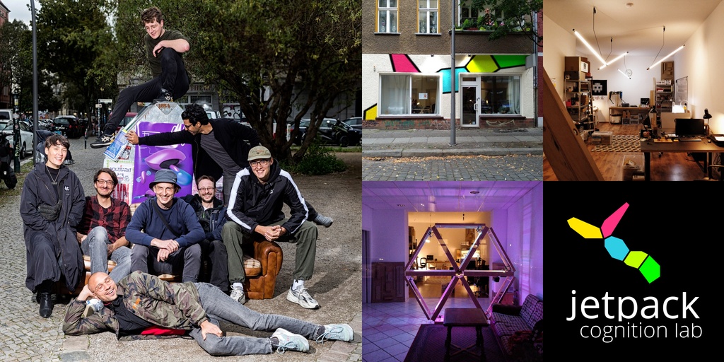 Jetpack Cognition Lab Teamfoto, Logo und Lab-Fassade.