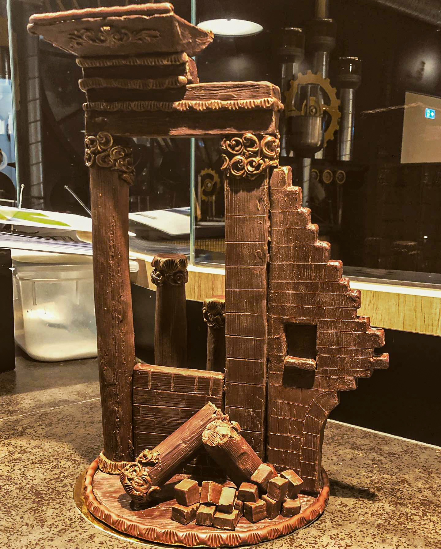 Das Schaustück von Momen Al-Mahamid zeigt das "Prinzessinenbett" in der Altstadt von Bosra/ Darra in Syrien. Im Jahre 2012 wurde diese Sehenswürdigkeit durch die syrische Armee komplett zerstört. Momen lässt sie in seiner Schokoladenskulptur weiterleben.