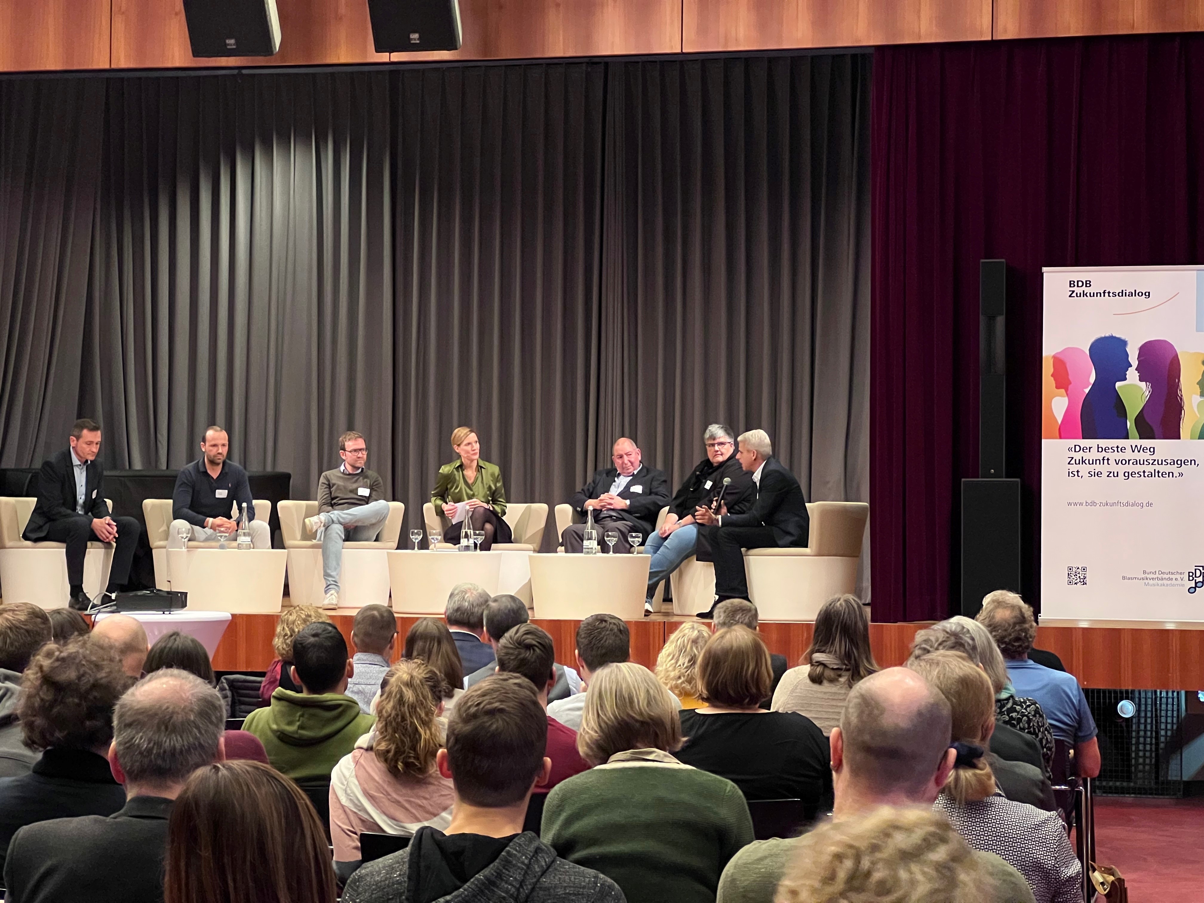 Ralph Beck (BDB), Kerem Sargut (Manos Holding), Dr. Benedikt Link (Fundmate), Moderatorin Denise Burgert, Michael Weber (BDB) Dr. Petra Schneidewind (PH Ludwigsburg) und Dr. Patrick Rapp (BDB-Präsident) stellten sich bei Zukunftsdialog im Experten-Talk den Fragen der Teilnehmenden.