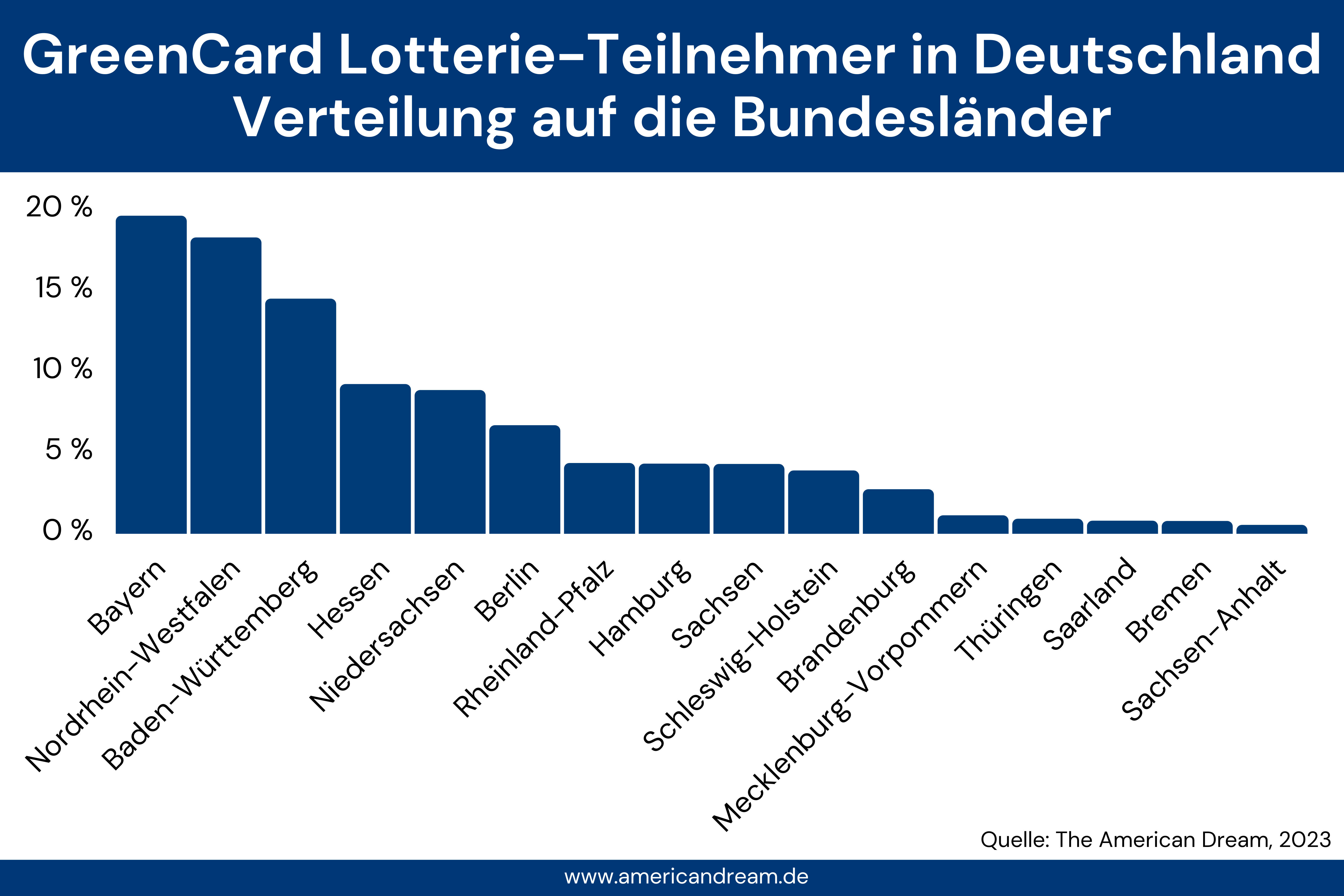 19,6 % aller deutschen Green Card Lotterie-Teilnehmer kamen während der DV-2024 aus Bayern. Auf Platz zwei liegt das bevölkerungsreichste Bundesland Nordrhein-Westfalen (18,2 %), dicht gefolgt von Baden-Württemberg (14,4 %). Auffällig sind die verhältnismäßig hohen Teilnehmerzahlen aus Hamburg (4,3 %) im Vergleich zum Anteil des norddeutschen Bundeslandes an der deutschen Gesamtbevölkerung (nur ca. 2,2 %).