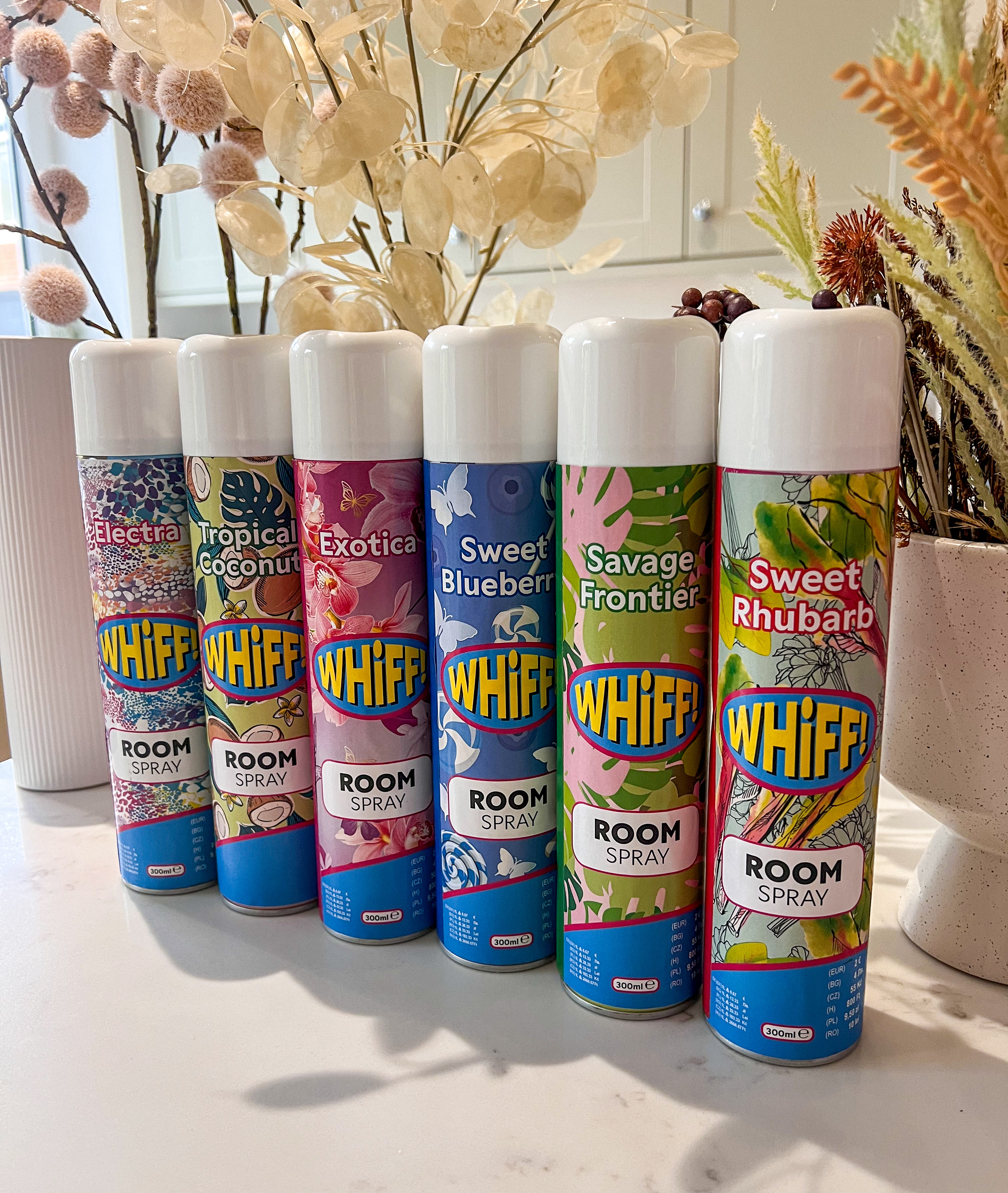 Das Whiff! Raumspray in den Duftkompositionen Electra, Tropical Coconut, Exotica, Sweet Blueberry, Savage Frontier und Sweet Rhubarb