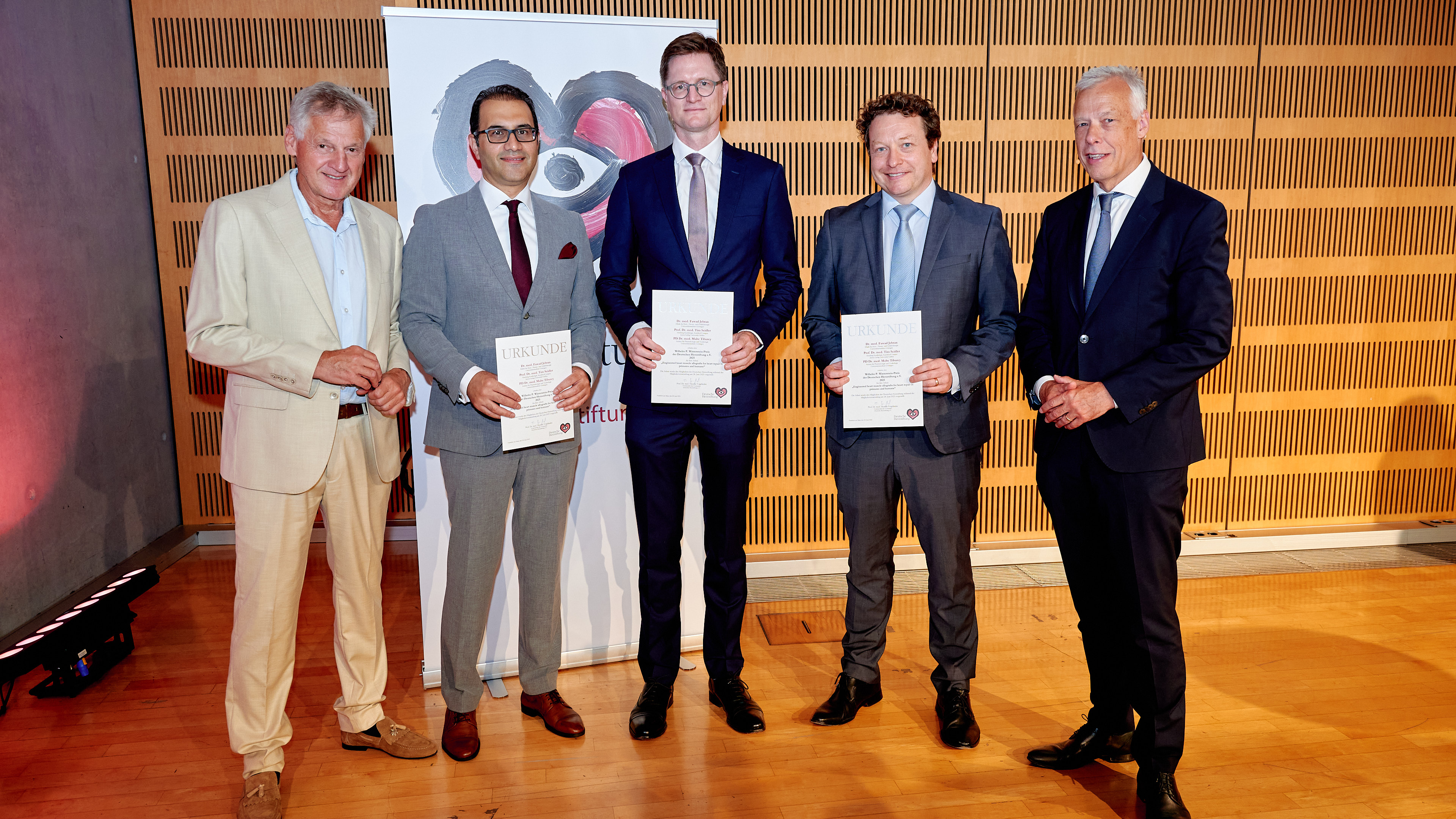 Von links: Prof. Dr. Armin Welz, Vorsitzender des Wissenschaftlichen Beirats der Deutschen Stiftung für Herzforschung, Dr. med. Fawad Jebran, Klinik für Thorax-, Herz- und Gefäßchirurgie, Universitätsmedizin Göttingen, Prof. Dr. med. Tim Seidler, Abteilung Kardiologie, Kerckhoff-Klinik, Bad Nauheim, PD Dr. med. Malte Tiburcy, Institut für Pharmakologie und Toxikologie, Universitätsmedizin Göttingen, Prof. Dr. Thomas Voigtländer, Vorstandsvorsitzender der Deutschen Herzstiftung.