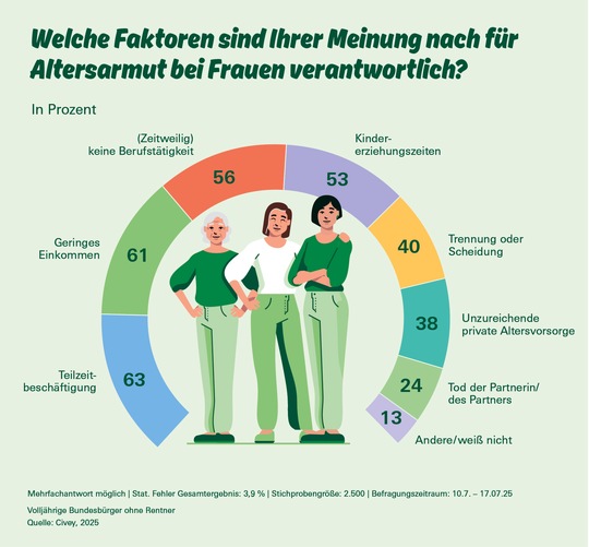 Teilzeit, Einkommensunterschiede und Kindererziehung sind für Altersarmut bei Frauen verantwortlich. Quelle: Civey / DEVK