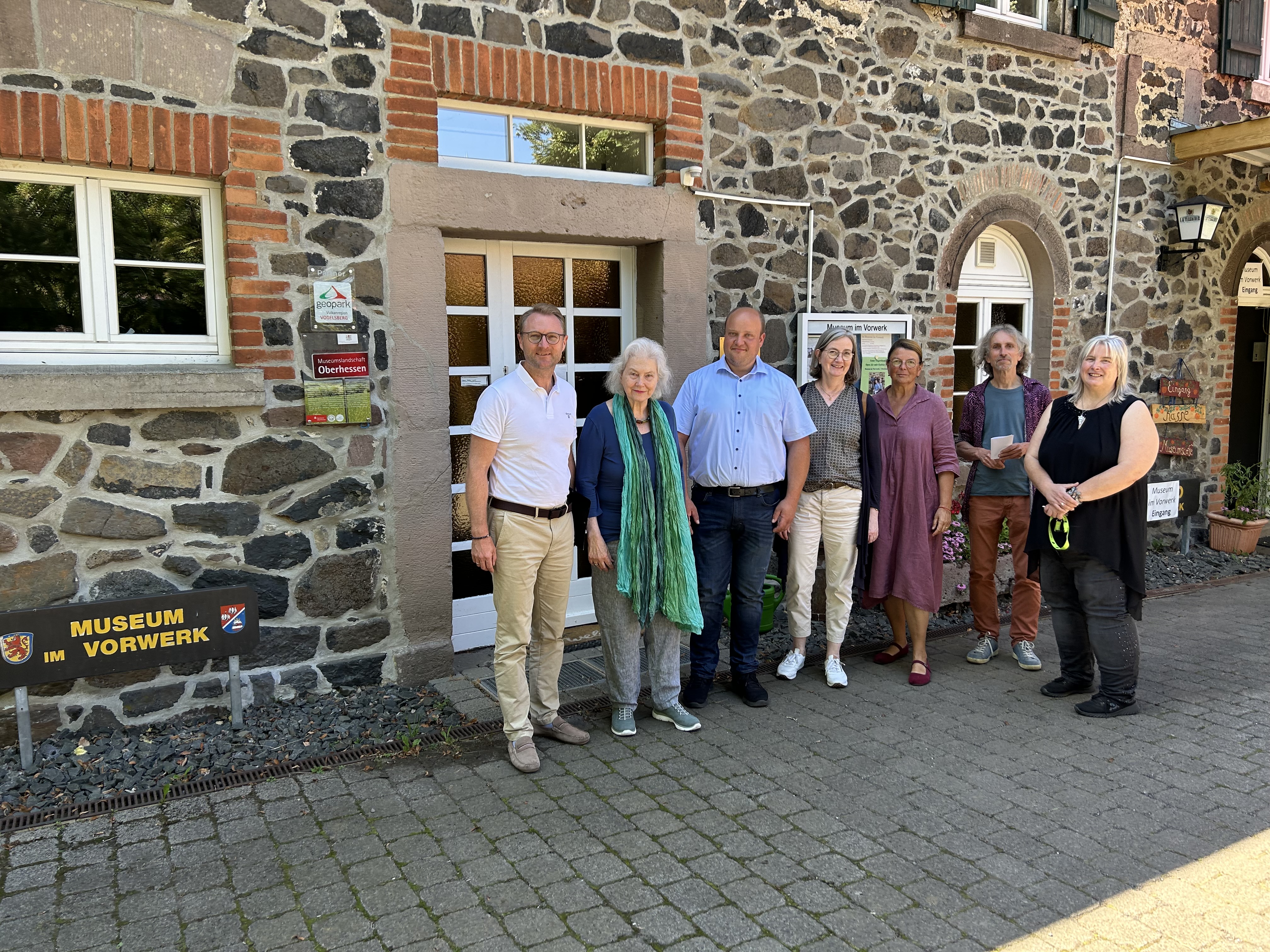 Landrat und Kulturdezernent Dr. Jens Mischak (links) zu Gast in den geschichtsträchtigen Ulrichsteiner Mauern. Gemeinsam mit Dr. Steffen Scharmann (Dritter von links), Bürgermeister der Stadt Ulrichstein, und Andrea Ortstadt, Sachgebietsleiterin Wirtschaftsförderung, Tourismus und Kultur im Amt für Wirtschaft und den ländlichen Raum, wird er dort von der 1. Vorsitzenden Helga Weigand (Zweite von links), Museumsleiterin Susanne Zejewski-Dützer (von rechts), sowie von Manfred Purr und Ockje Maecker vom Vorwerk-Museum begrüßt. (Foto: Vogelsbergkreis/C.Lips)