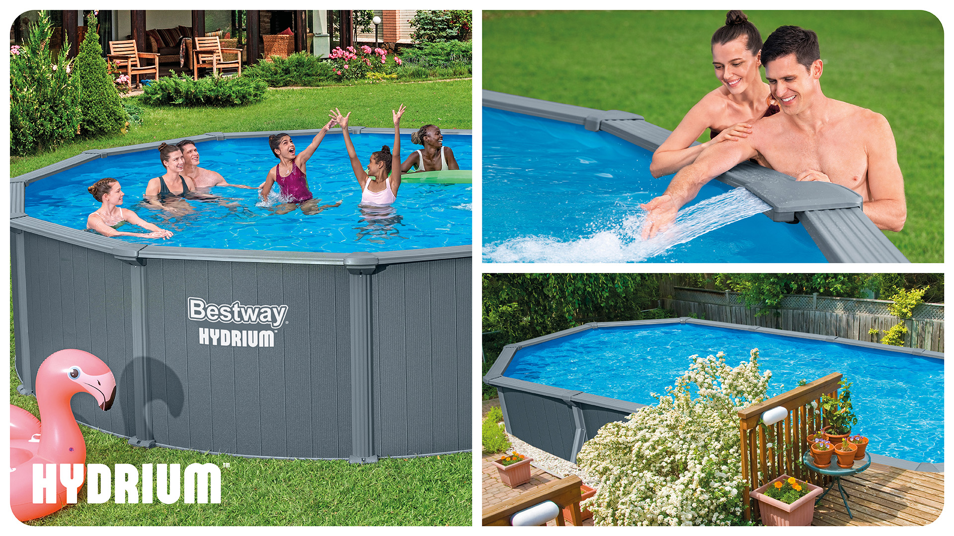Stilvolle Integration in den Außenbereich: Der Bestway® Hydrium™ Stahlwandpool besticht durch seine moderne graue Außenwand und lässt sich ideal in bestehende Terrassenlandschaften einbinden. Dank seiner robusten, winterfesten Konstruktion kann er zudem das ganze Jahr über im Garten stehen bleiben.