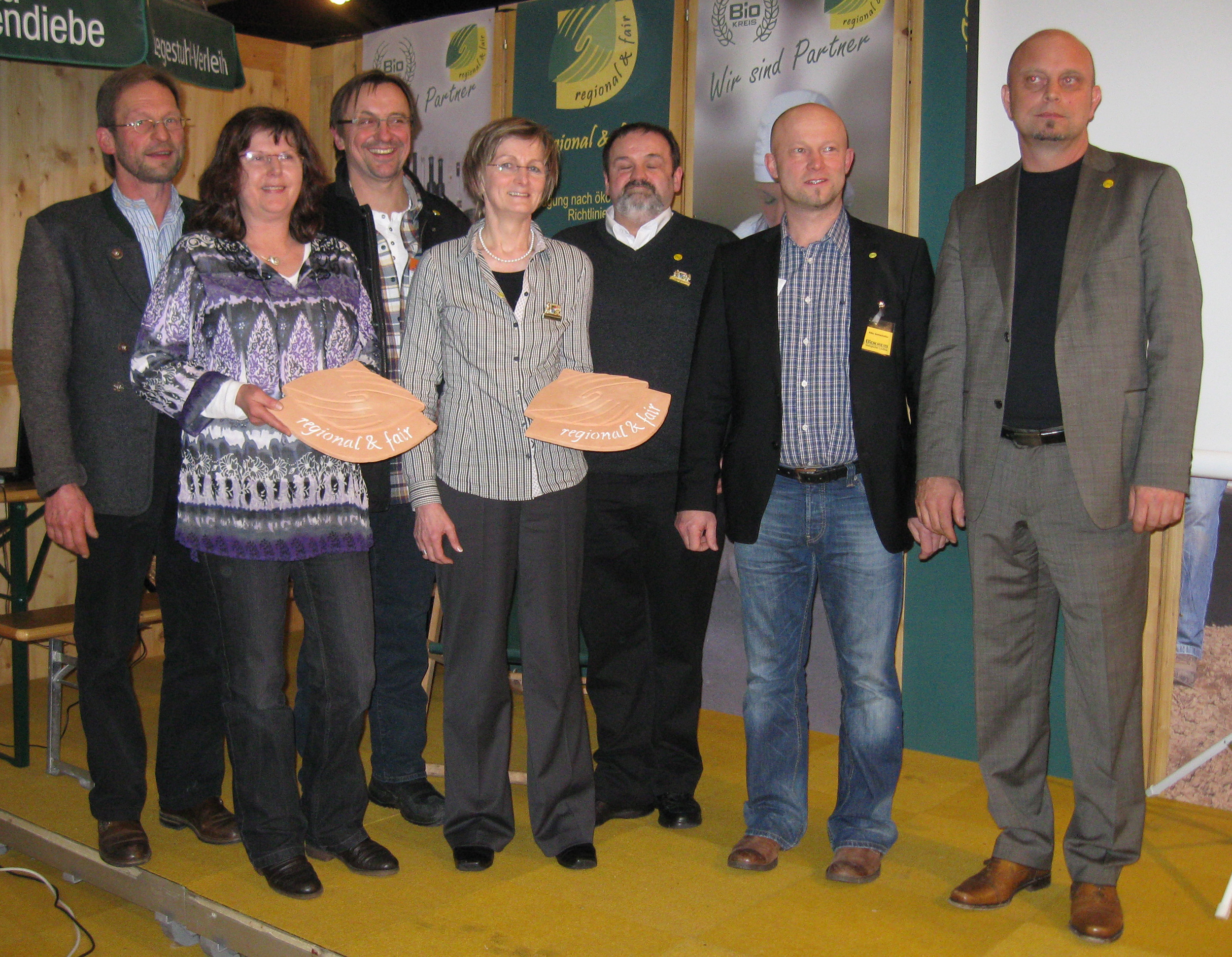 Der Biokreis gratuliert zur "regional & fair" – Auszeichnung. (von links nach rechts): Hans Meier (2. Vorstand Biokreis), Heidi und Harald. Wohlfahrt, Gerlinde und Walter Herzog,, Niko Gottschaller (1. Vorstand Biokreis), Sepp Brunnbauer (Biokreis-Geschäftsführer)