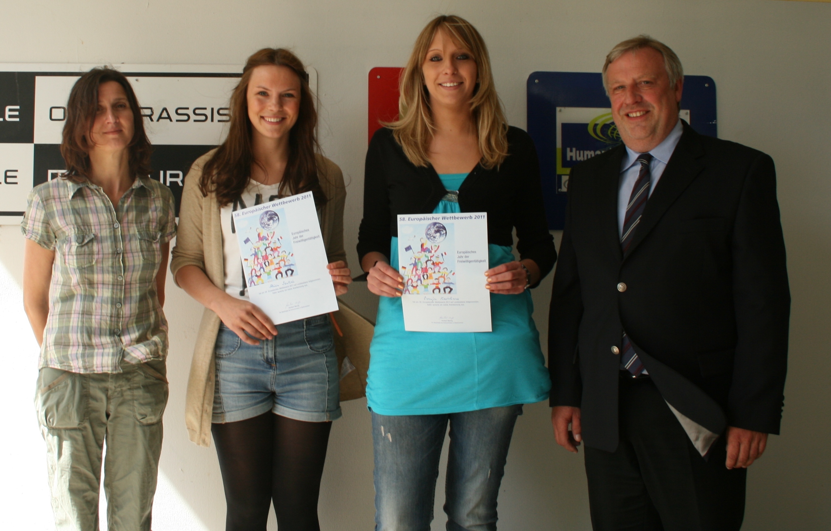 Erneut gewinnen Schülerinnen der hannoverschen BBS Handel beim Europäischen Wettbewerb. Fachlehrerin Dagmar Illner, die Auszubildenden Alisa Senkel und Svenja Kestenhus sowie Schulleiter Joachim Kreter vor dem Eingang der Schule an der Brühlstraße (von links nach rechts)