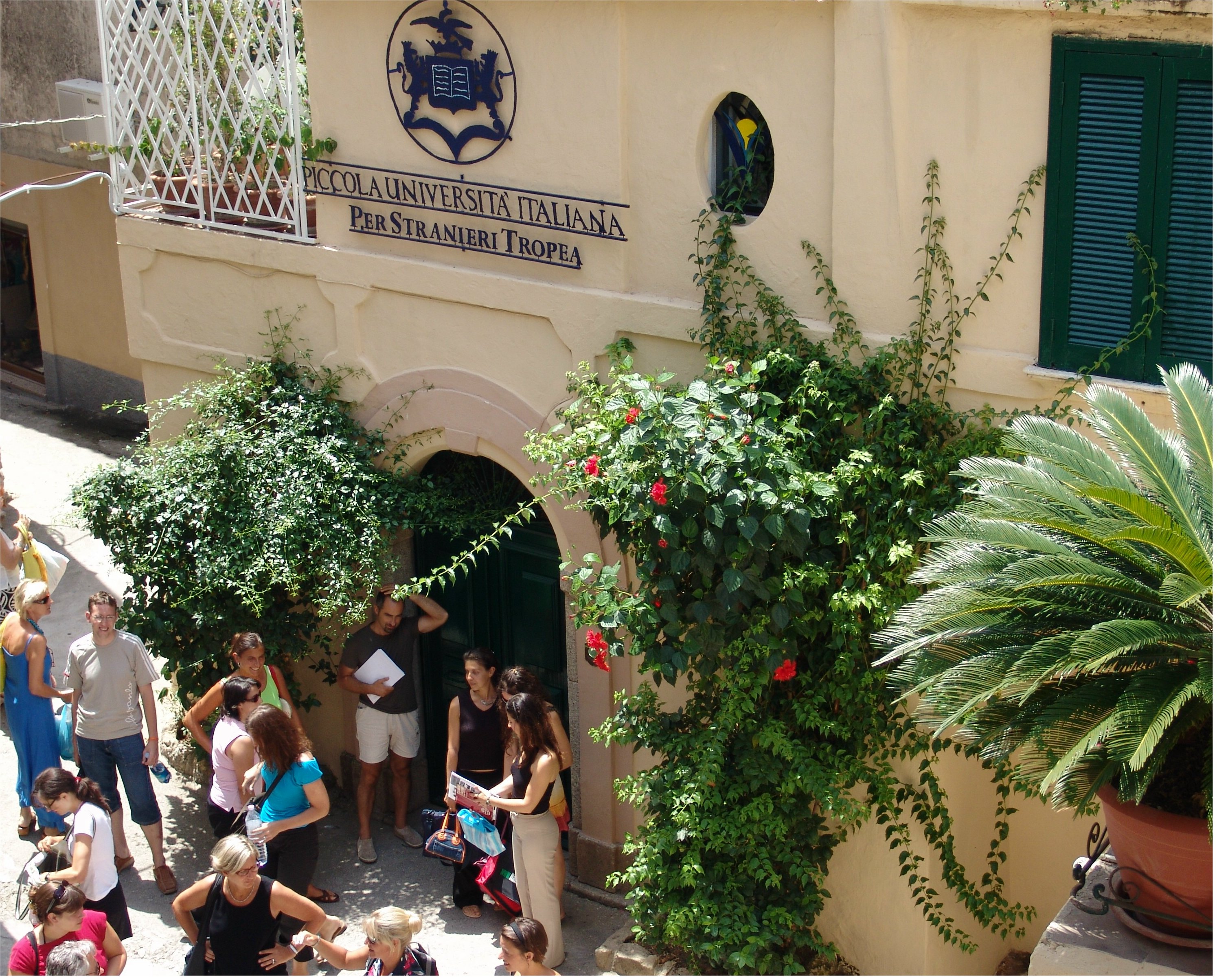 Der Sitz der Schule ist in einem Palazzo aus dem 18. Jhdt. Hier die Studenten auf der "Piazza" vor der Schule.