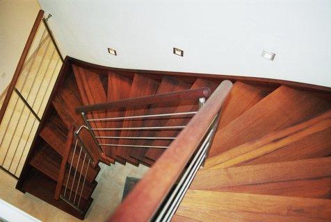 Freitragende Bolzentreppe BAVEG-BBT mit Wandwange in Holzart Merbau mit Design-Geländer ROMA ? Ausführung mit rundem Holzhandlauf in Merbau
