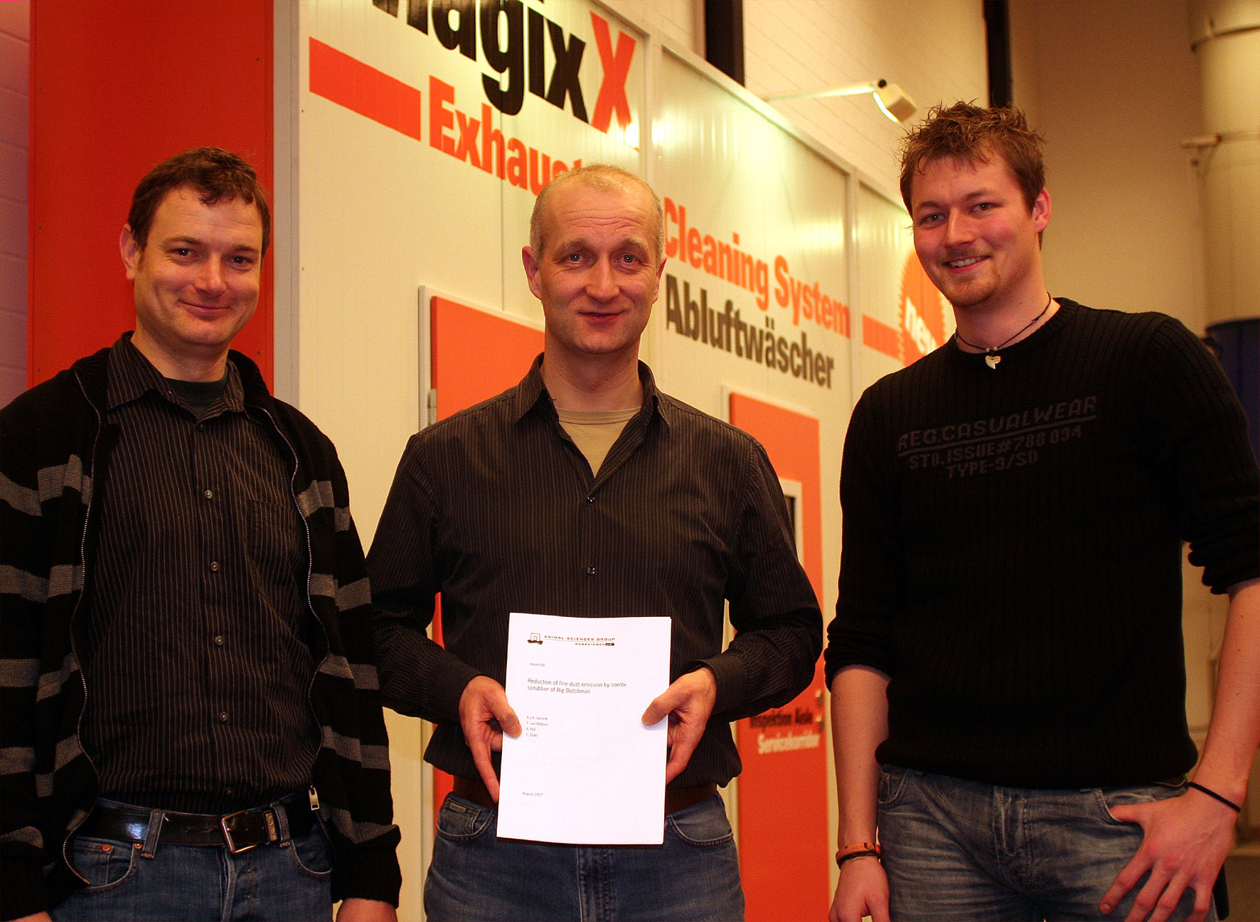 Von links nach rechts: Das MagixX-Entwickler-Team, bestehend aus Dr. Ralf Kosch, Andreas Kerßens und Felix Penkhues, präsentiert stolz die Urkunde aus Holland. Im Hintergrund ein Ausstellungsstück des Abluftwäschers MagixX