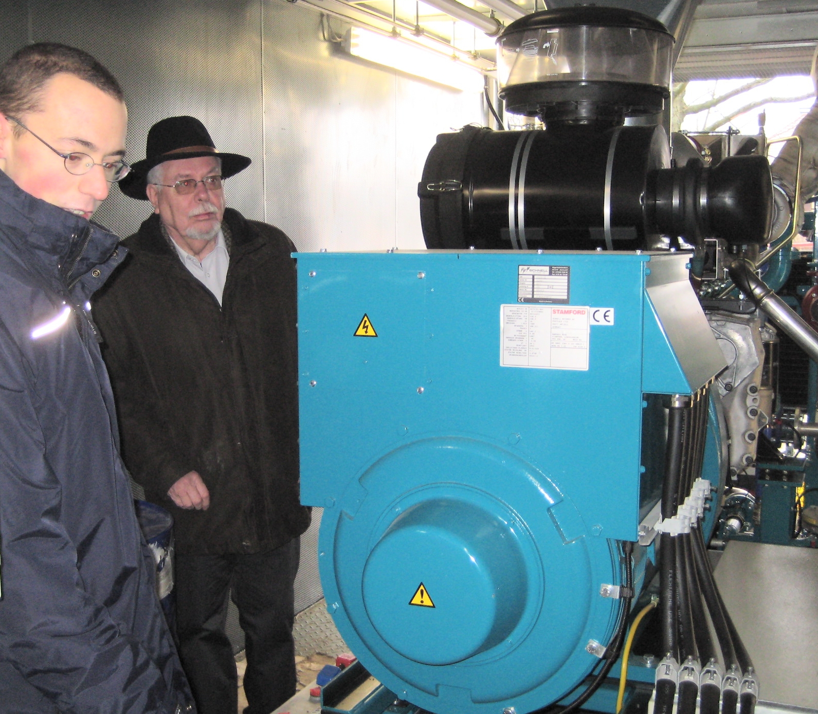 Energie- und Landwirt Andreas Feick (links) erläutert Gebäudemanagement-Dezernent Hanns Michael Diening die Wirkungsweise des Biogas-Blockheizkraftwerks in Maar, das künftig die Grundschule mit Wärme versorgen wird / Foto: Vogelsbergkreis