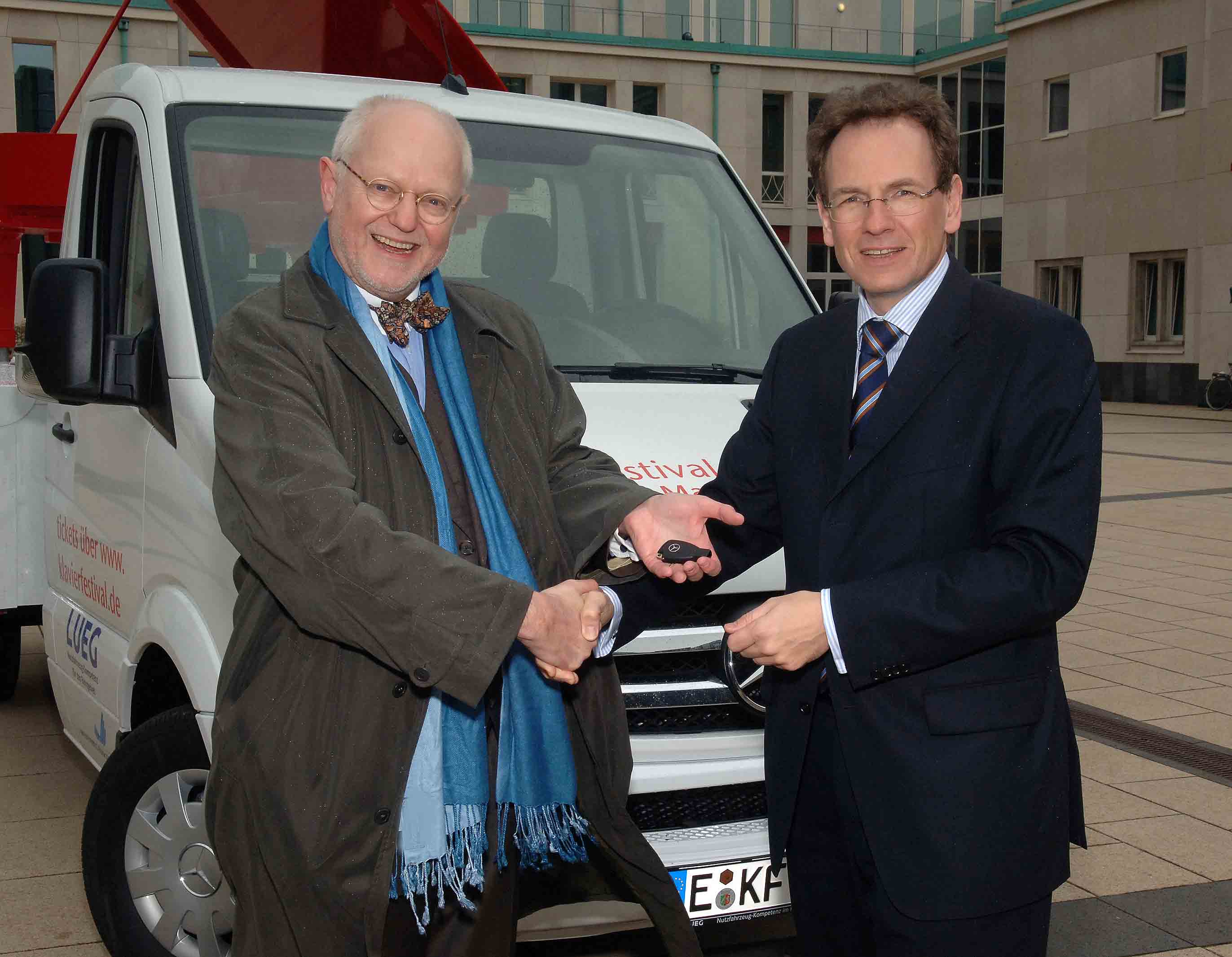 Bei der Schlüsselübergabe:(von links) Prof. Franz Xaver Ohnesorg (Intendant des Klavier-Festival Ruhr und Geschäftsführer des Initiativkreis Ruhrgebiet), Thomas Holtgräfe (Mitglied des Vorstands der Fahrzeug-Werke LUEG AG)