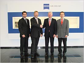Peter Schlindwein (Zweiter von links), Leiter des Supply Chain Managements von Carl Zeiss SMT, gratuliert Dr. Axel Deich (Zweiter von rechts), Geschäftsführer der Oerlikon Space AG, zur Ernennung zum Supply Chain Partner von Carl Zeiss SMT
