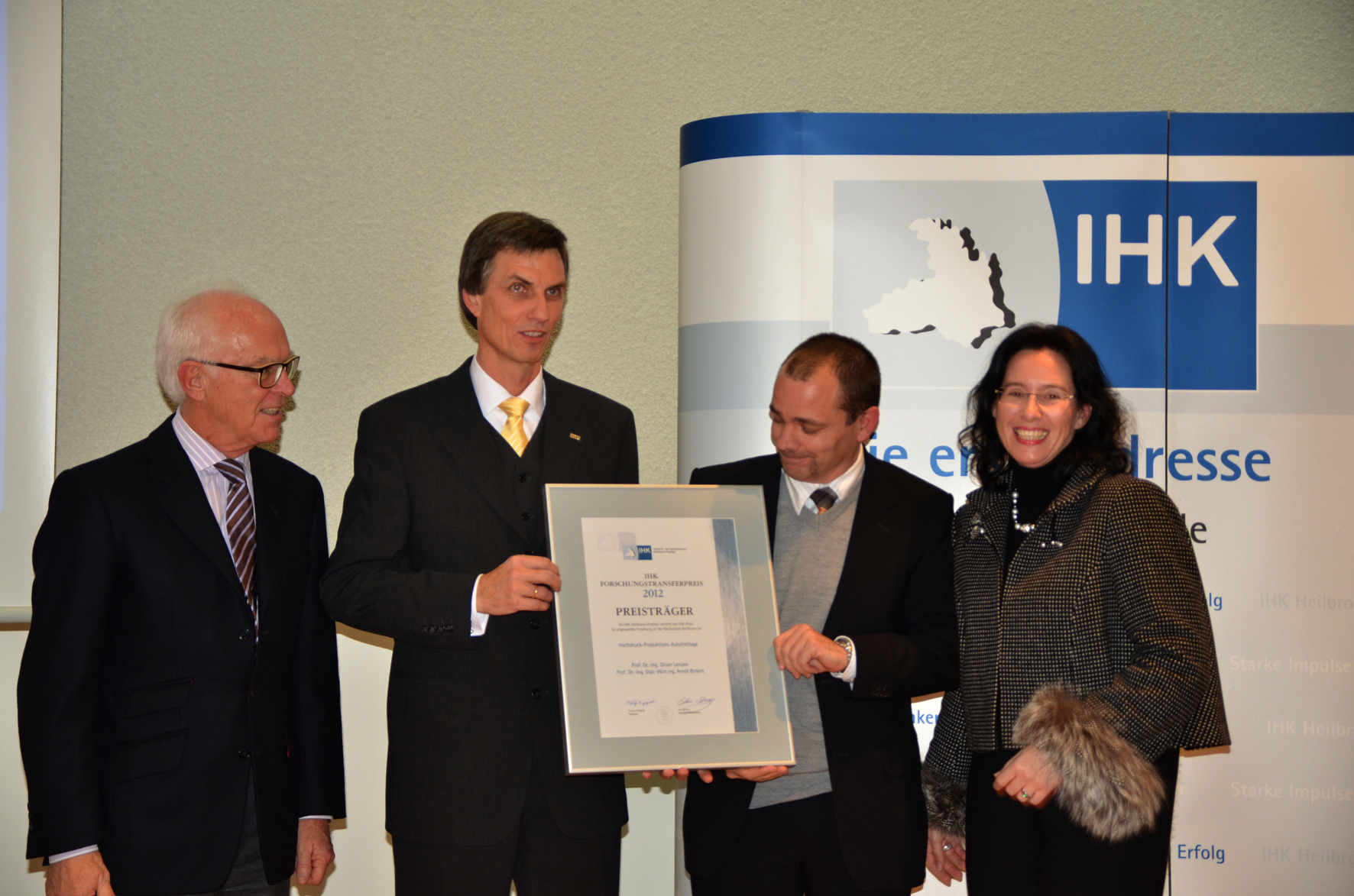 Preisträger des IHK-Forschungstransferpreises 2012 / v.l.n.r. Thomas Philippiak (Präsident IHK Heilbronn-Franken), Prof. Dr.-Ing. Oliver Lenzen (Preisträger), Prof. Dr.-Ing. Arndt Birkert (Preisträger), Kirsten Hirschmann (Laudatorin und Vizepräsidentin der IHK Heilbronn-Franken) / Bild: IHK Heilbronn-Franken