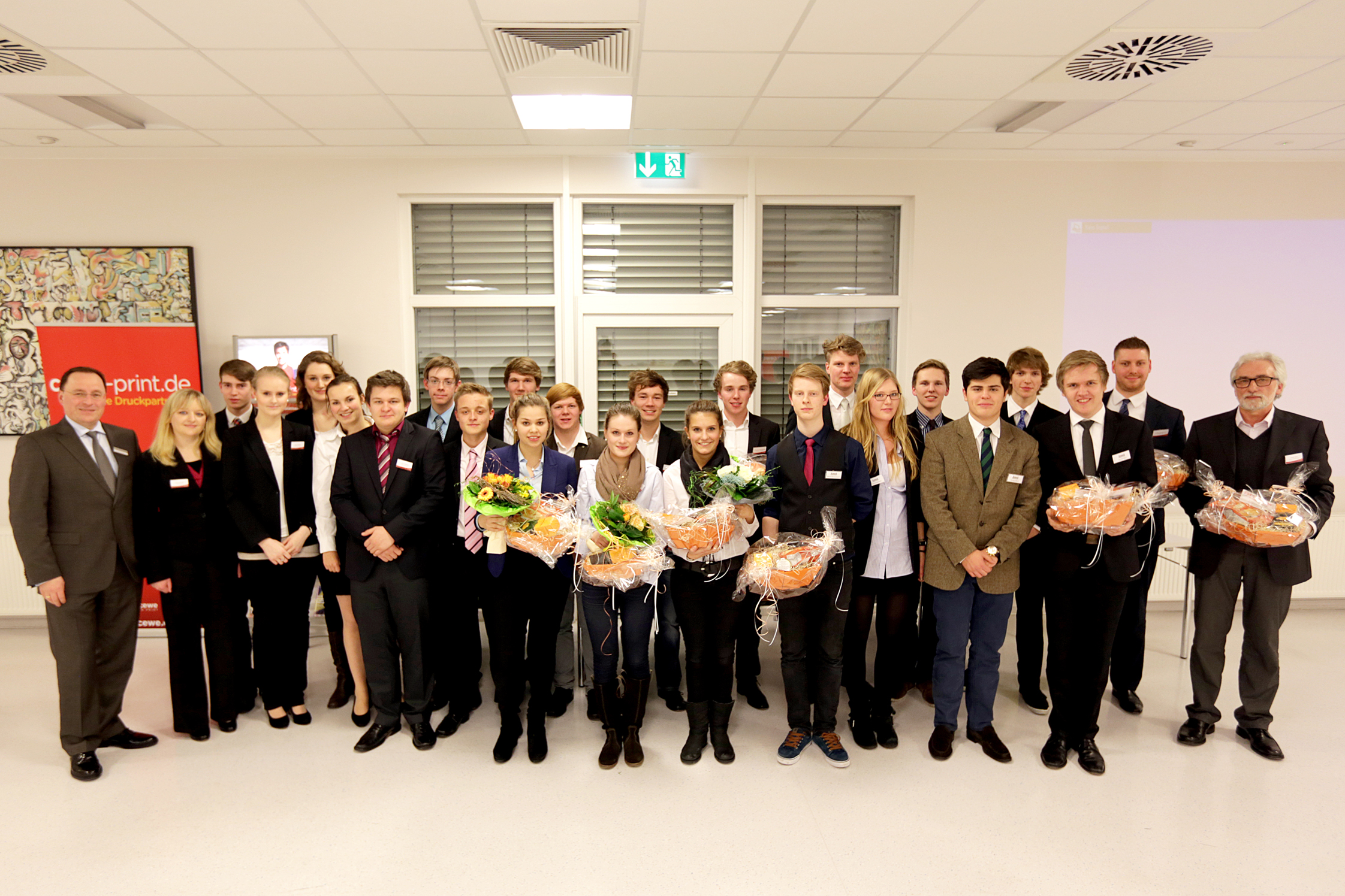 Beim Management Information Game erhielten 21 Schüler der Liebfrauenschule Oldenburg in der vergangenen Woche einen praxisorientierten Einblick in die Leitung eines börsennotierten Unternehmens. Der Leiter des Planspiels Herr Warfelmann und ihr Lehrer Herr Bick (rechts) freuten sich über ihr Engagement. Unterstützung erhielten sie dabei von Herrn Kluge, Geschäftsführer und verantwortlich für den Bereich Personal bei CEWE am Standort Oldenburg, und Frau Plichta aus dem Bereich Ausbildung bei CEWE (links). Das Unternehmen Glowing Systems AG überzeugte beim Planspiel die fachkundige Jury