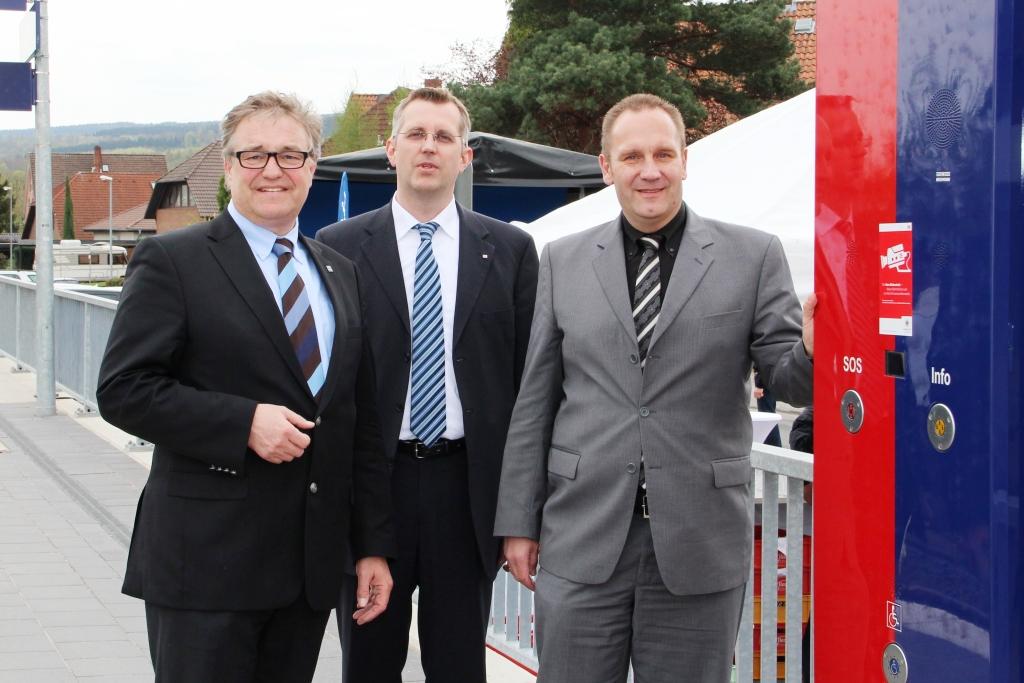 Regionspräsident Hauke Jagau, Jörn Tunat, Bahnhofsmanager Hannover der DB Station&Service AG, und Barsinghausens Bürgermeister Marc Lahmann freuen sich über den umgestalteten Haltepunkt