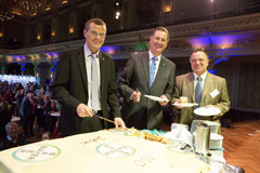 Unser Foto zeigt (v. l. n. r.): Dr. Klaus Jelich, Standortleiter Bayer Healthcare Wuppertal, Oberbürgermeister Peter Jung sowie Prof. Dr. Andreas Busch, Leiter der Pharmaforschung und frühe Entwicklung sowie Mitglied des Bayer HealthCare Executive Committee beim Anschneiden der Geburtstagstorte zur 150 Jahrfeier