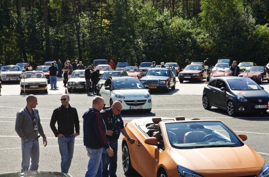 Stimmungsvoll: Die Teilnehmerfahrzeuge der Creme 21 Rallye auf dem Skidpad des Opel Testzentrums in Dudenhofen am letzten Tag
