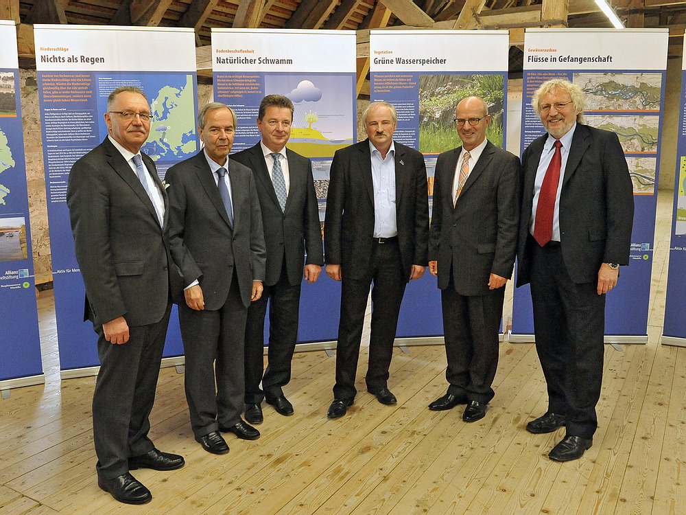 Diskutierten über Probleme und Chancen beim Hochwasserschutz (v.l.n.r.): Gerd Sonnleitner (Ehrenpräsident des Deutschen Bauernverbandes), Prof. Dieter Stolte (Kuratoriumsvorsitzender der Allianz Umweltstiftung), Dr. Lutz Trümper (Oberbürgermeister Magdeburg), Olaf Tschimpke (NABU-Präsident), Dr. Lutz Spandau (Vorstand der Allianz Umweltstiftung) und Reinhard Vogt (Leiter der Hochwasserschutzzentrale Köln)