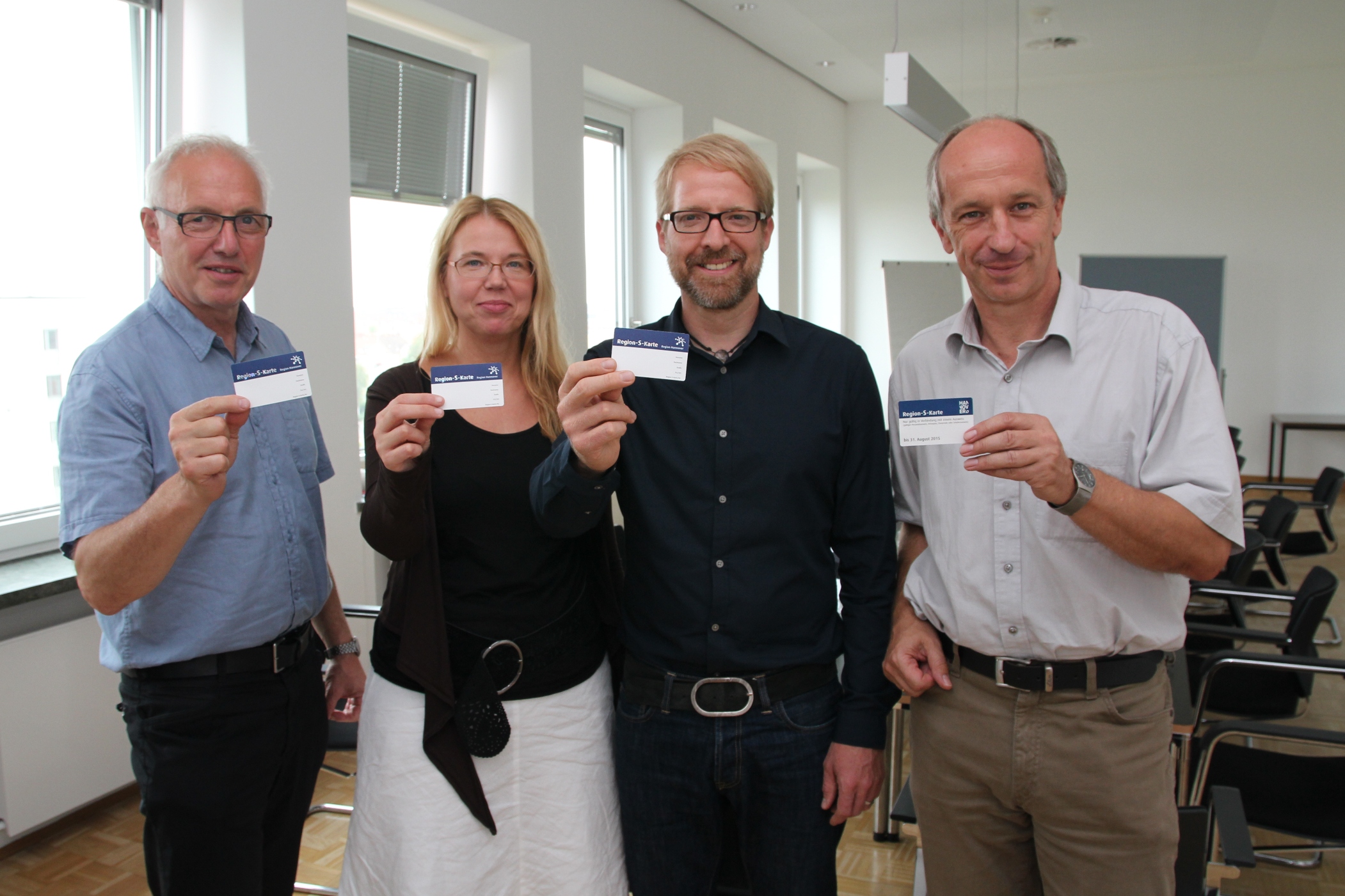 Stellten im Regionshaus die neue Region-S-Karte und die Entwicklung des Sozialtarifs für Busse und Bahnen vor (von links): Erwin Jordan, Regionsdezernent für soziale Infrastruktur, Anja Krause, Leiterin des Teams Zentrale Fachbereichsangelegenheiten / Steuerung SGB II im Fachbereich Soziales, Markus Gogolin vom Team Zentrale Fachbereichsangelegenheiten / Steuerung SGB II, und Ulf Mattern, Leiter des Teams ÖPNV-Marketing im Fachbereich Verkehr