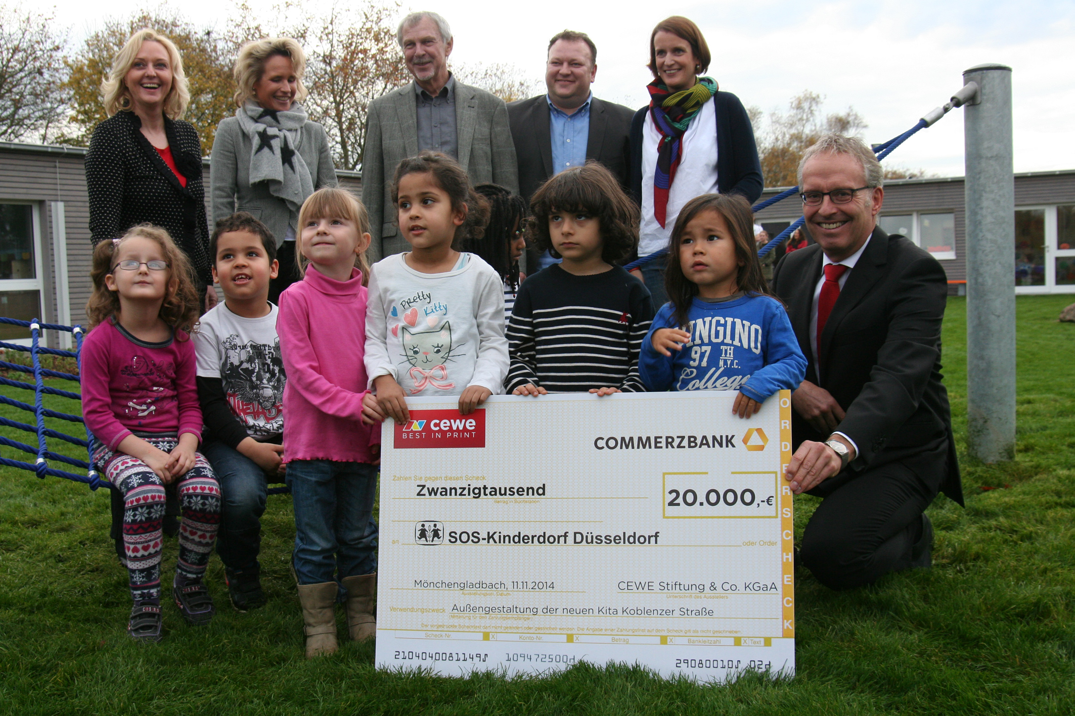 Bei der Scheckübergabe für die Einrichtung der SOS-Kindertagesstätte Koblenzer Straße: hintere Reihe v.l.n.r.: Dr. Christine Hawighorst, verantwortlich für Presse- und Öffentlichkeitsarbeit/ Nachhaltigkeit bei CEWE, Sabine Fuchs, Geschäftsführerin der SOS-Kinderdörfer, Uwe Sievers, Bezirksvorsteher der Landeshauptstadt Düsseldorf, Herbert Stauber, Einrichtungsleiter des SOS-Kinderdorfs Düsseldorf, Alexandra Mertens, Verwaltung und Öffentlichkeitsarbeit des SOS-Kinderdorfs Düsseldorf; vordere Reihe v.l.n.r.: Kinder der SOS-Kita Düsseldorf, Matthias Meß, CEWE Geschäftsführer des Produktionsstandortes Mönchengladbach