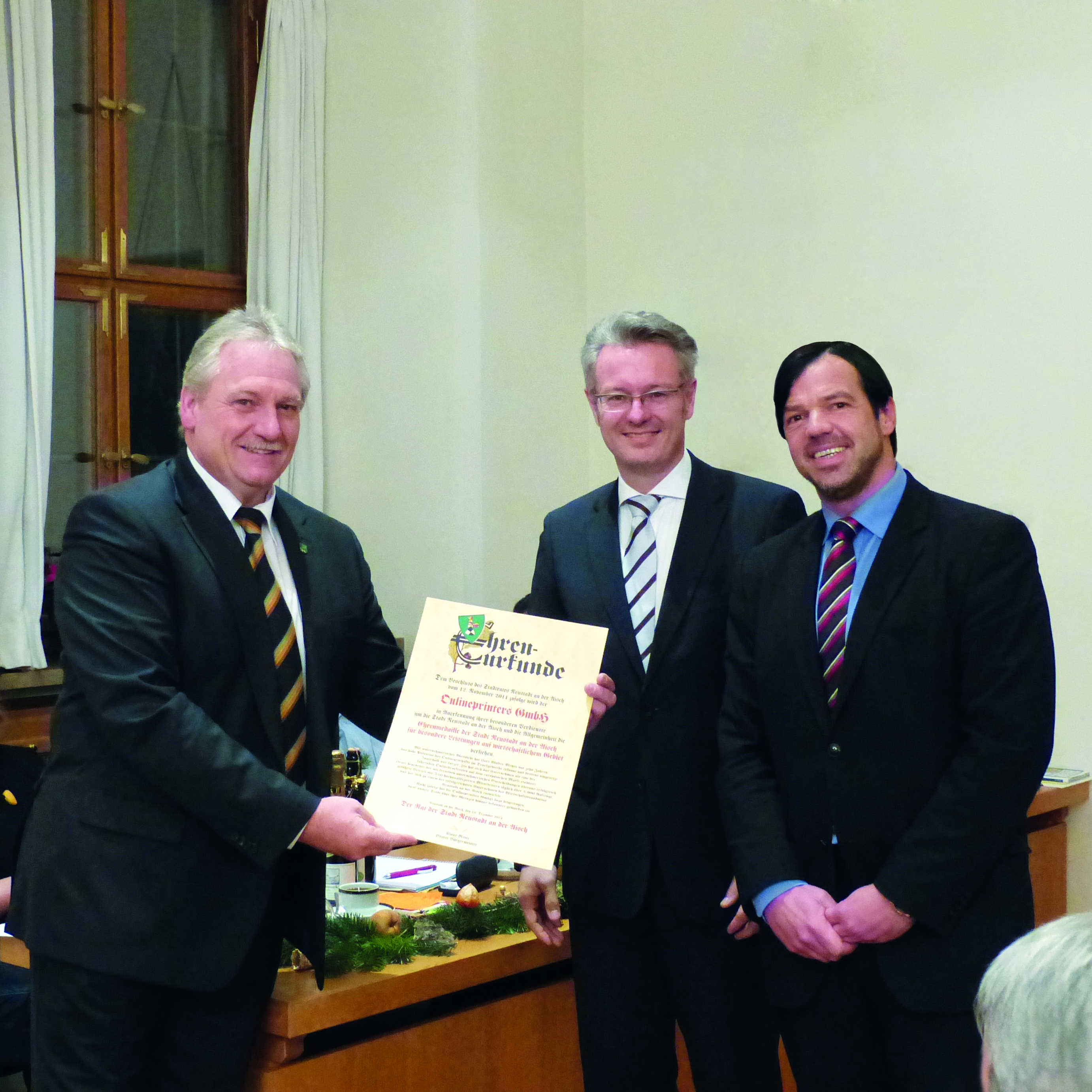 Feierliche Ehrung der Onlineprinters GmbH: Firmengründer und Geschäftsführer Walter Meyer (r.) sowie Geschäftsführer Dr. Michael Fries (2.v.l.) nehmen die Ehrenmedaille der Stadt Neustadt an der Aisch bei der Stadtratssitzung am 10.12.2014 entgegen. Der Erste Bürgermeister der Stadt Neustadt an der Aisch, Klaus Meier (l.), überreichte die Ehrenmedaille für besondere Leistungen auf wirtschaftlichem Gebiet.