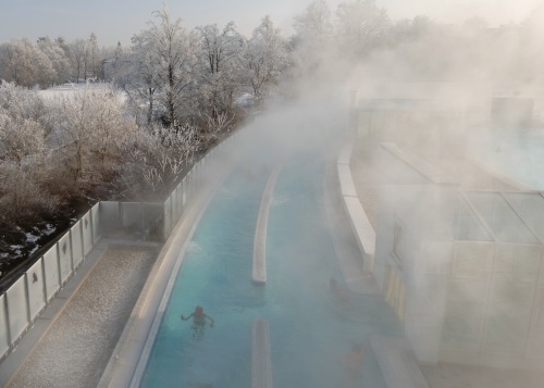 Wintersport der besonderen Art: Thermenwandern unter freiem Himmel, egal bei welchen Minustempe-raturen. Deutschlands längste "Thermalwasserstraße" im niederbayerischen Bad Füssing macht es möglich. Die meisten der über 100 Entspannungs-, Therapie- und Wohlfühlbecken in Europas weitläufigster Thermenlandschaft liegen im Freien und sind mit Wasserte