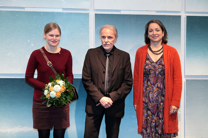 Von links: Miriam Hilker, Jörg Dreykluft und KWS Vorstandsmitglied Eva Kienle vor einem Kunstwerk der Ausstellung