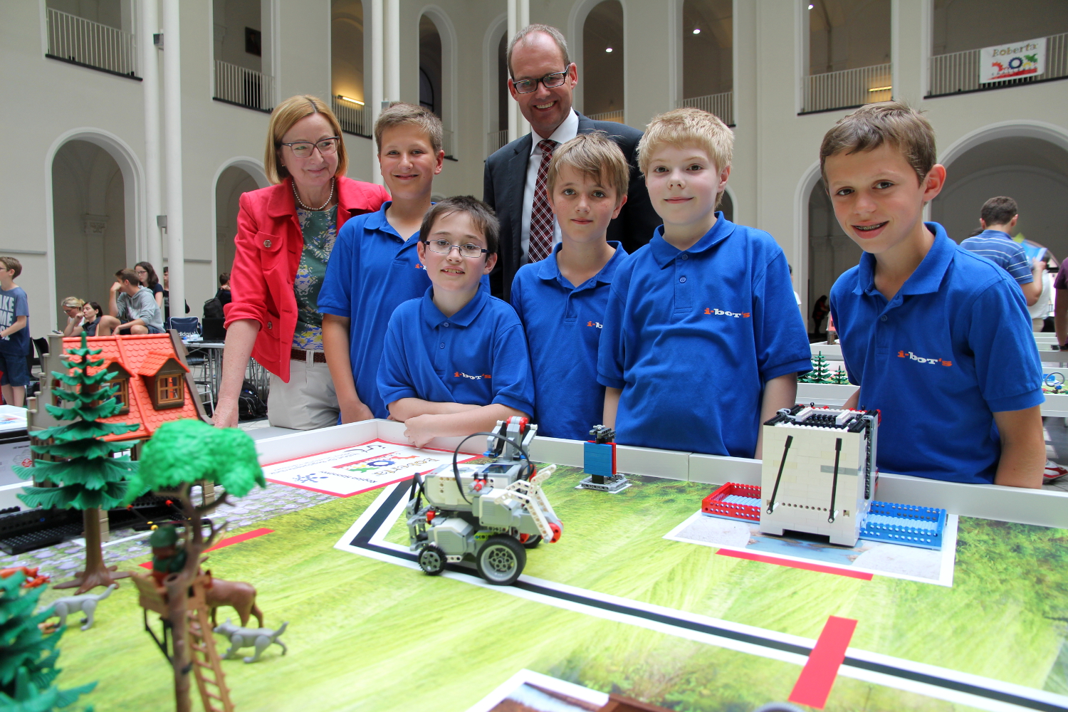 Erklären das Spielfeld: Die jungen Gewinner des Teams „ibots juniors“ mit Onno Maaß (11, v. l.), Artur Kolodziej (11), Fabian Weißbach (11), Julian Fuchs (11) und Lennard Lessig (11) erklären Ingelore Hering, Abteilungsleiterin im Niedersächsischen Ministerium für Wirtschaft und Ulf-Birger Franz, Wirtschaftsdezernent der Region Hannover, was die Roboter auf dem Spielfeld geleistet haben