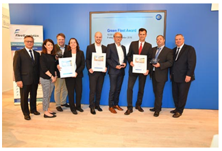 Arnd Martin (ganz rechts), Geschäftsführer Fleet Company GmbH, und Markus Stumpp (ganz links), Mitglied der Geschäftsleitung FleetCompany GmbH, überreichen den GreenFleet®-Award auf der IAA 2015 an Mariella Birkmayer, Wolfgang Stenger, Leiter Procurement und Daniela Estermann von MSC Sharp & Dohme GmbH; Konrad Fels und Geschäftsführer Klaus Baumg