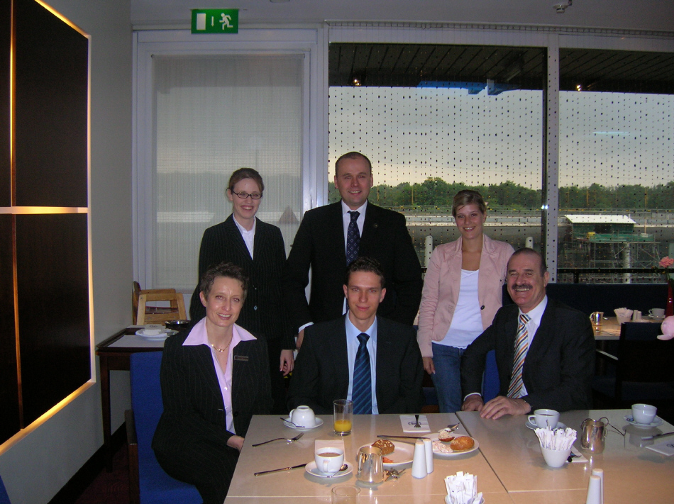 Hinten: M.Brase (Auszubildende und Azubi-Sprecherin), S.Konter (Generaldirektor), S.Küpper (Auszubildende) Vorne: A.Tumforde (Training Manager), D.Engelmann (Auszubildender aus dem ArabellaSheraton Grand Hotel in München), G.Crettaz (Personaldirektor)