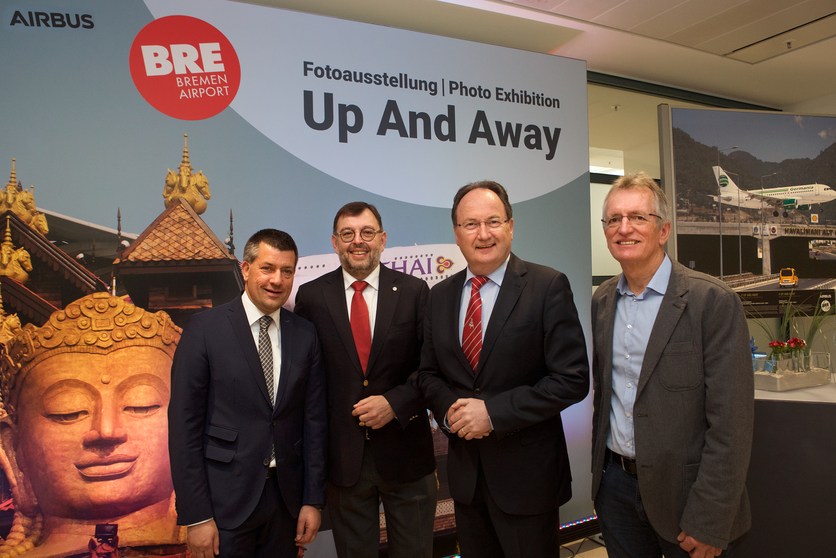 Zur Eröffnung von UP AND AWAY am Flughafen (von links nach rechts):Dr. André Walter, Standortleiter Airbus Bremen, Jürgen Bula, Geschäftsführer Bremen Airport, Peter Siemering, Geschäftsführer BTZ und Luftfahrt-Fotograf Dietmar Plath