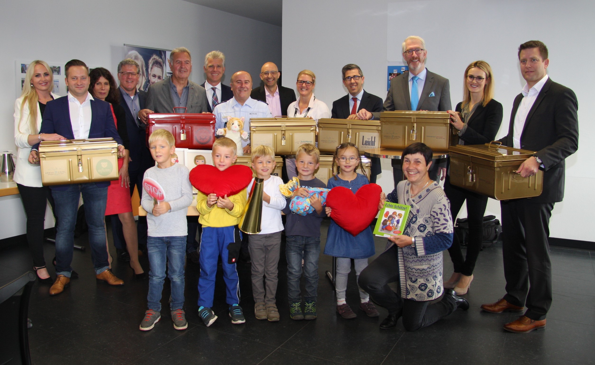 Die Sponsoren der 8 Schatzkisten, die drei Projektpartner: Stiftung Hänsel+Gretel, Polizeipräsidium Karlsruhe, Referat Prävention am Standort Pforzheim und Lilith-Beratungsstelle für Mädchen und Jungen zum Schutz vor sexueller Gewalt