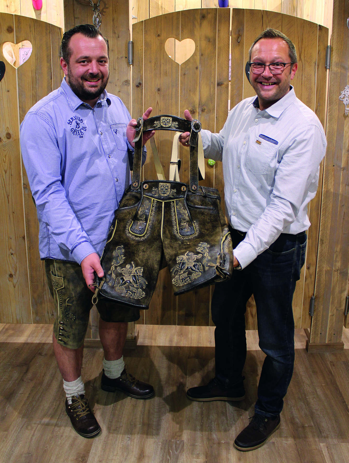 André Schlusen (li.) von Trachtenmode Schlusen und Xantens Bürgermeister Thomas Görtz präsentieren die neue Trachten-Lederhose „Xanten“, pünktlich vor dem Start des Oktoberfestes in Xanten